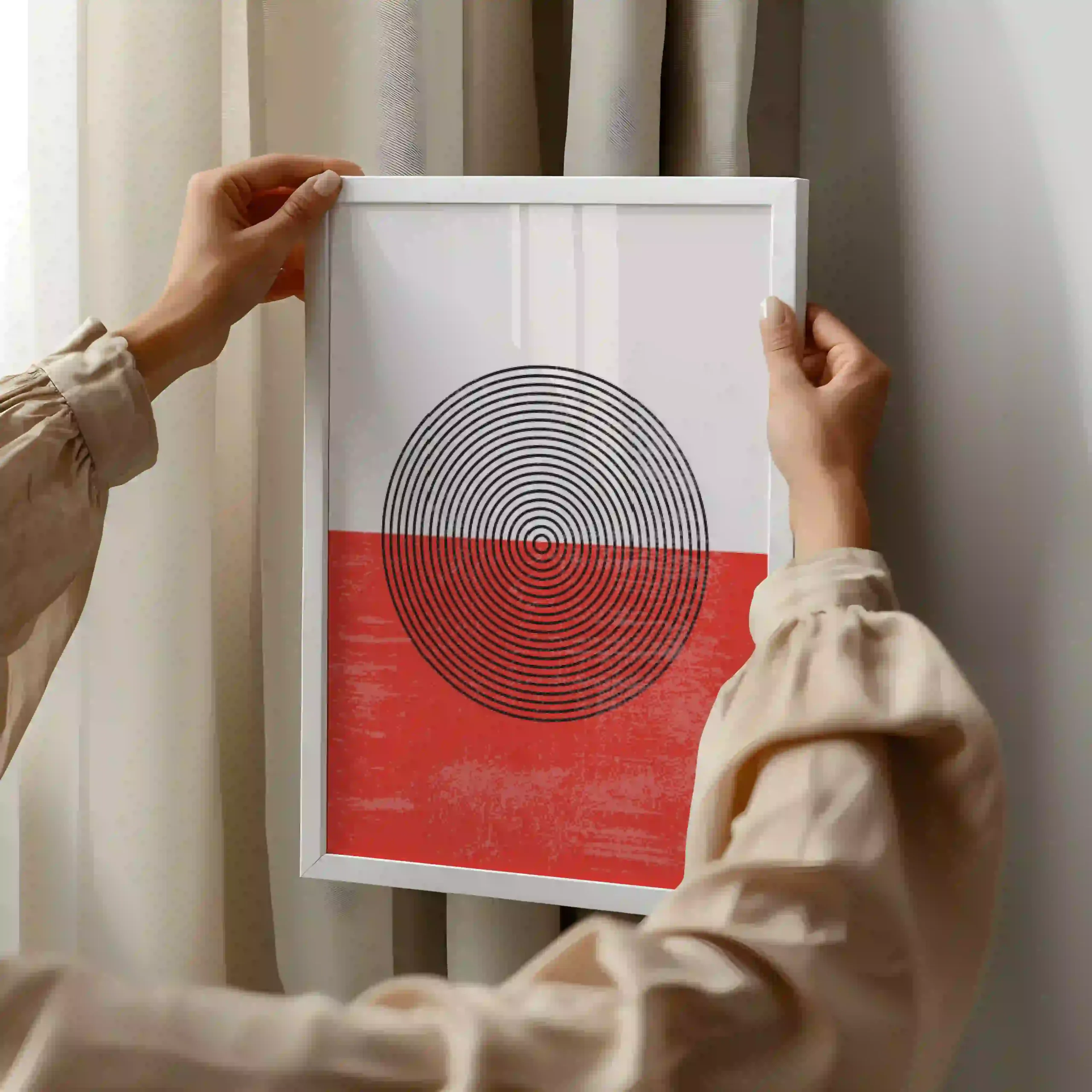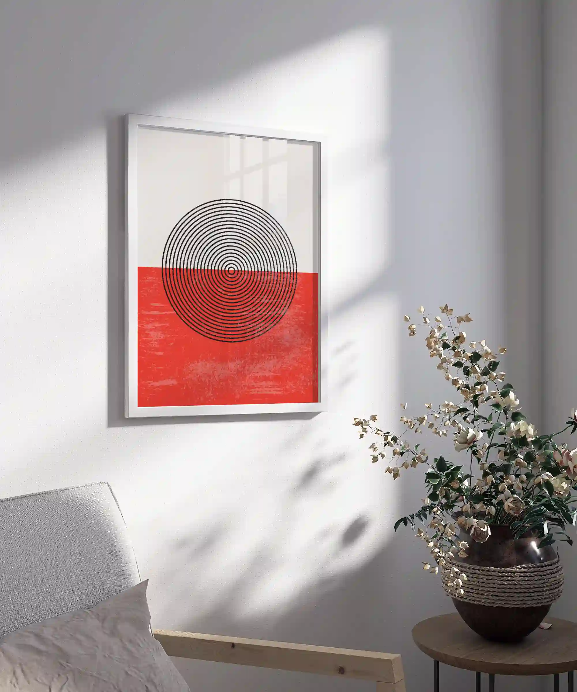 This bold abstract artwork features concentric circles over a vibrant red, grunge-textured background, blending geometric precision with raw texture. Its minimalist yet powerful design adds sophistication and energy to any space, making it a perfect statement piece for modern, bohemian, or eclectic interiors.