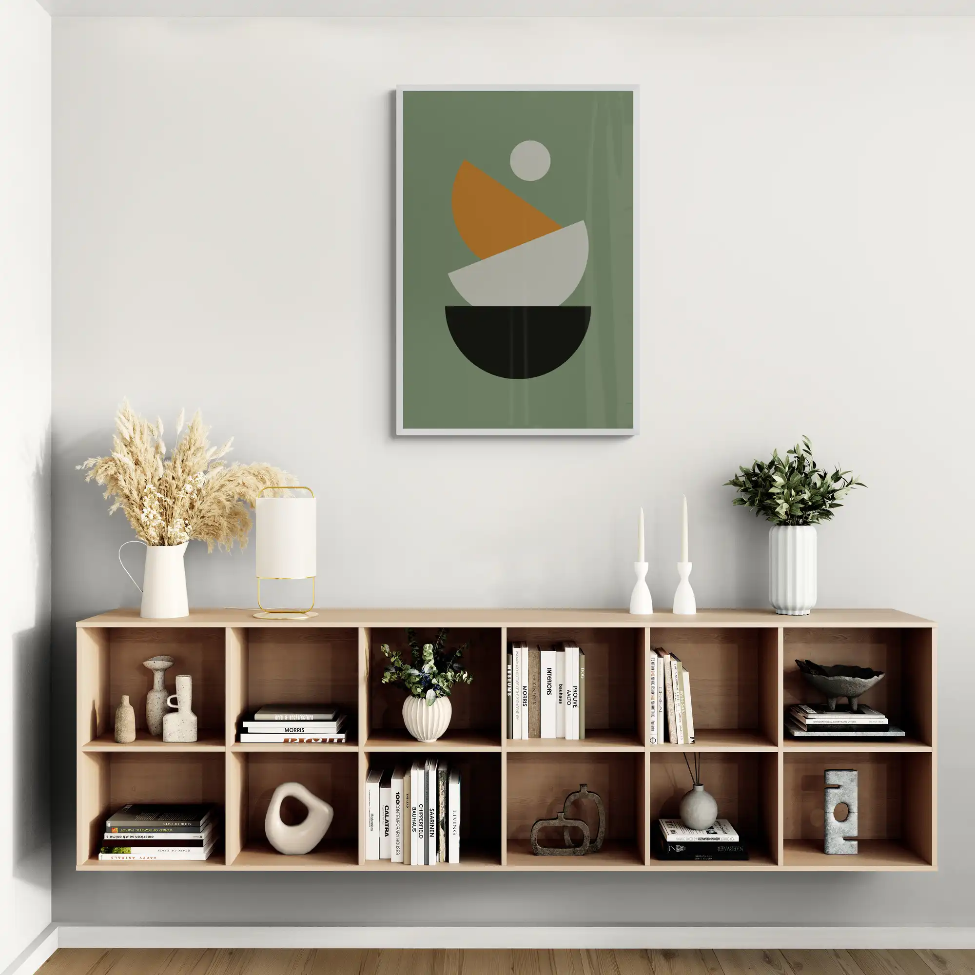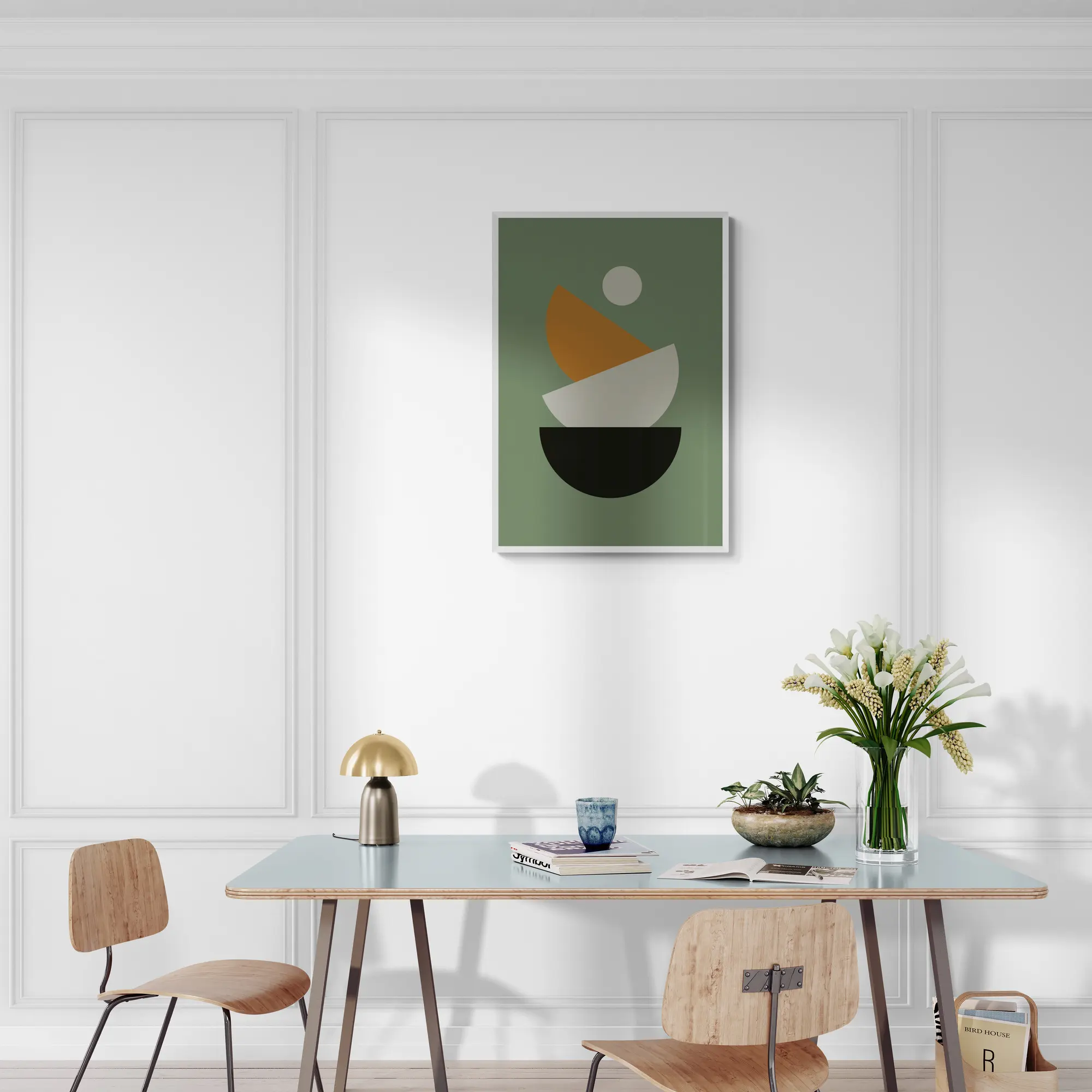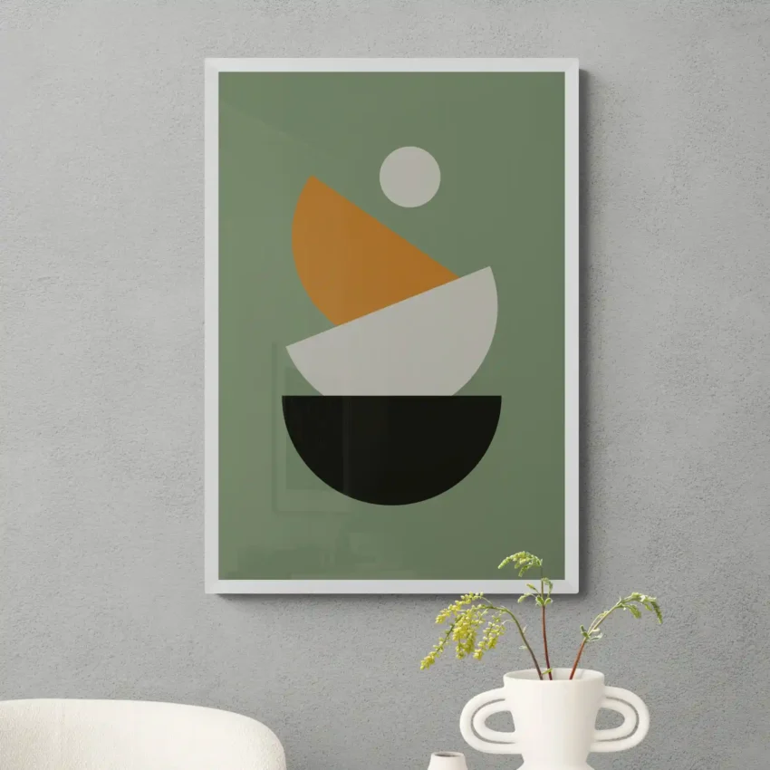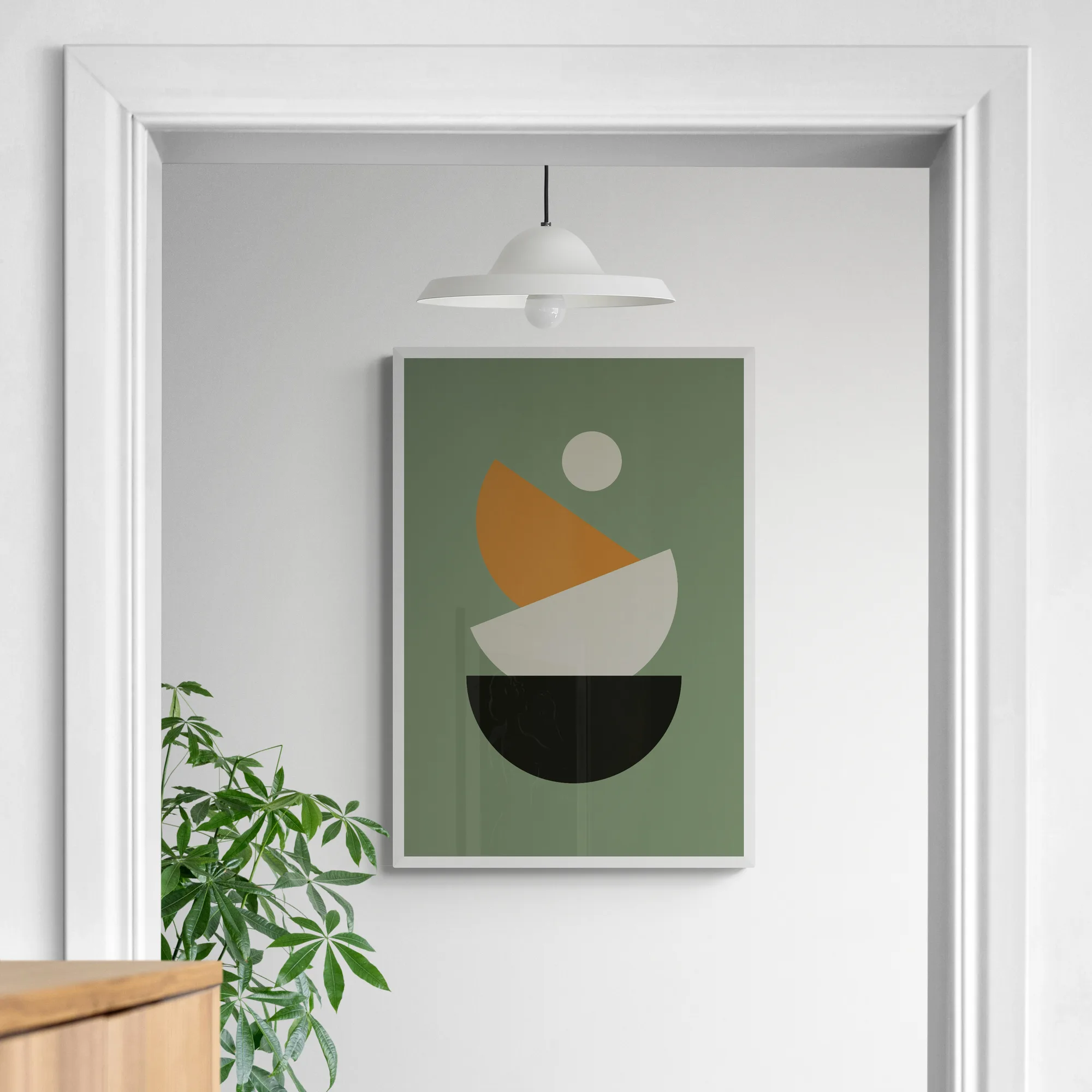 Elevate your space with this minimalist bohemian artwork, featuring clean geometric shapes in soothing earth tones. This framed art blends muted green, warm ochre, and deep charcoal to create a calming yet eye-catching focal point, perfect for adding understated elegance to any room.