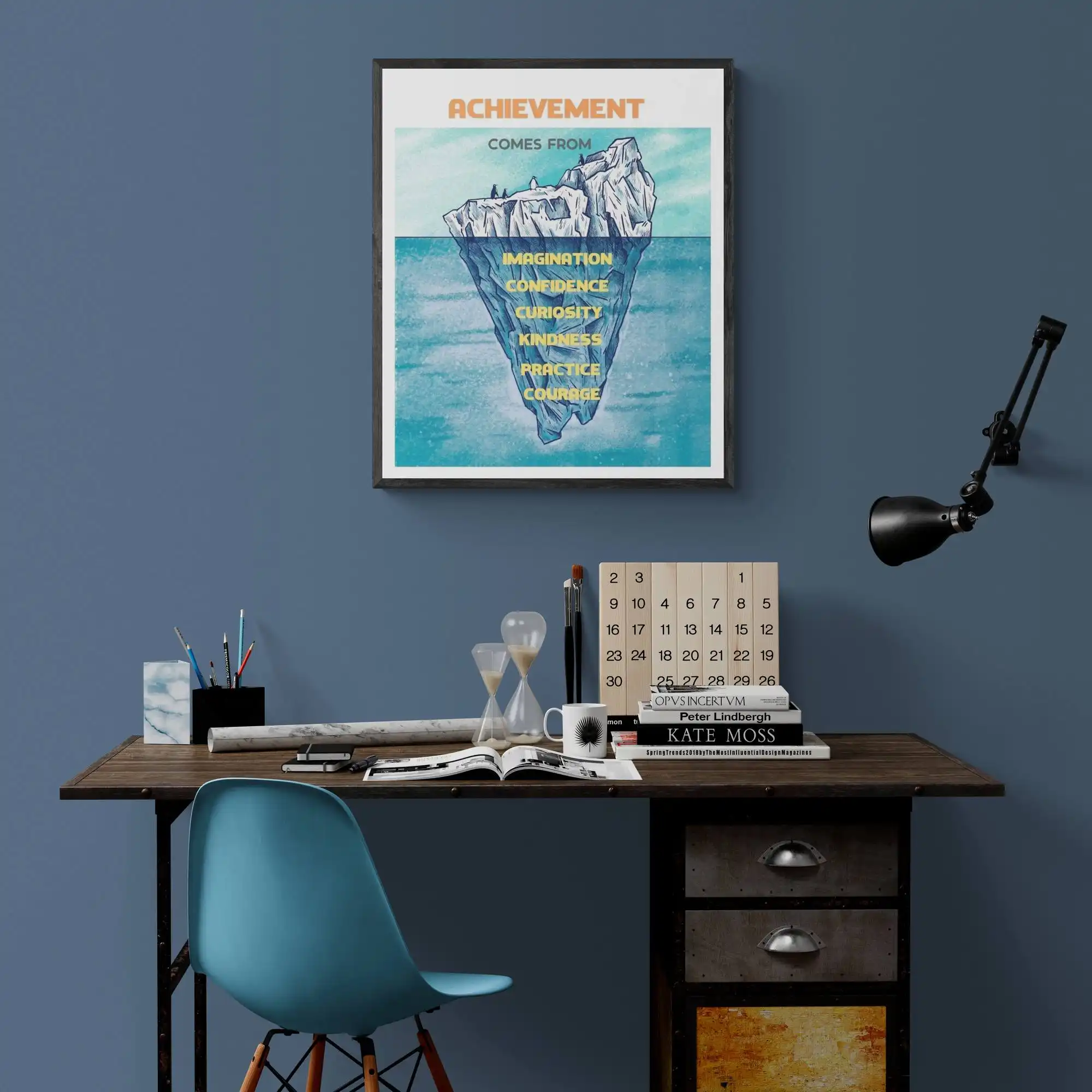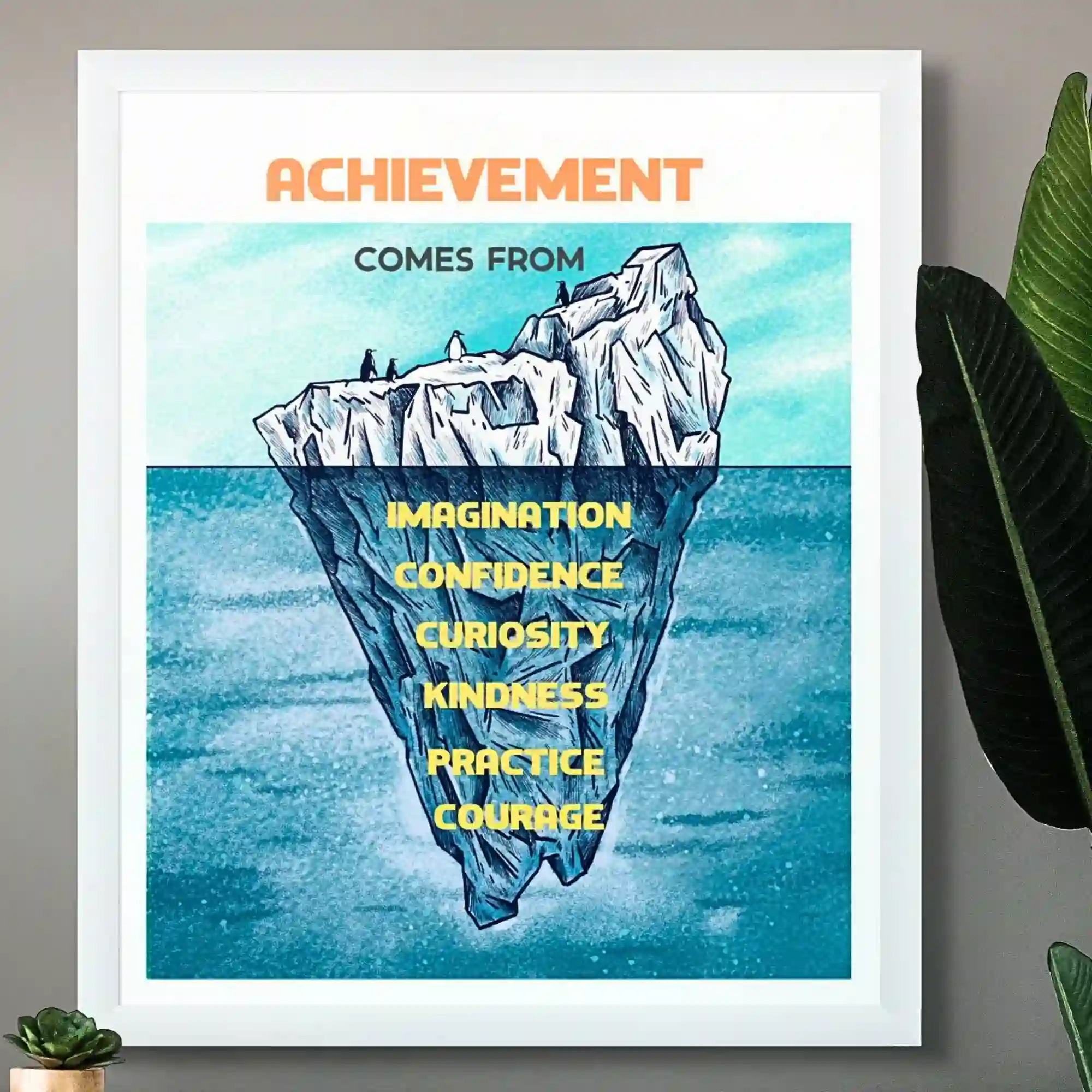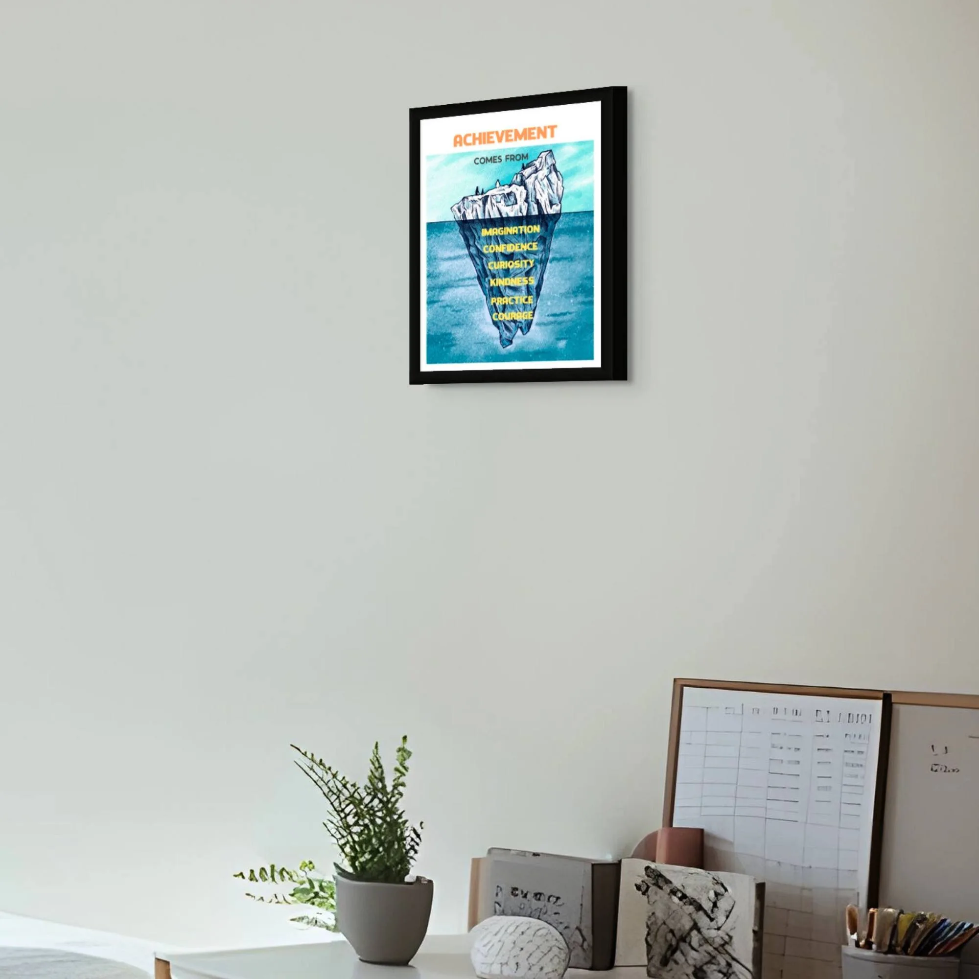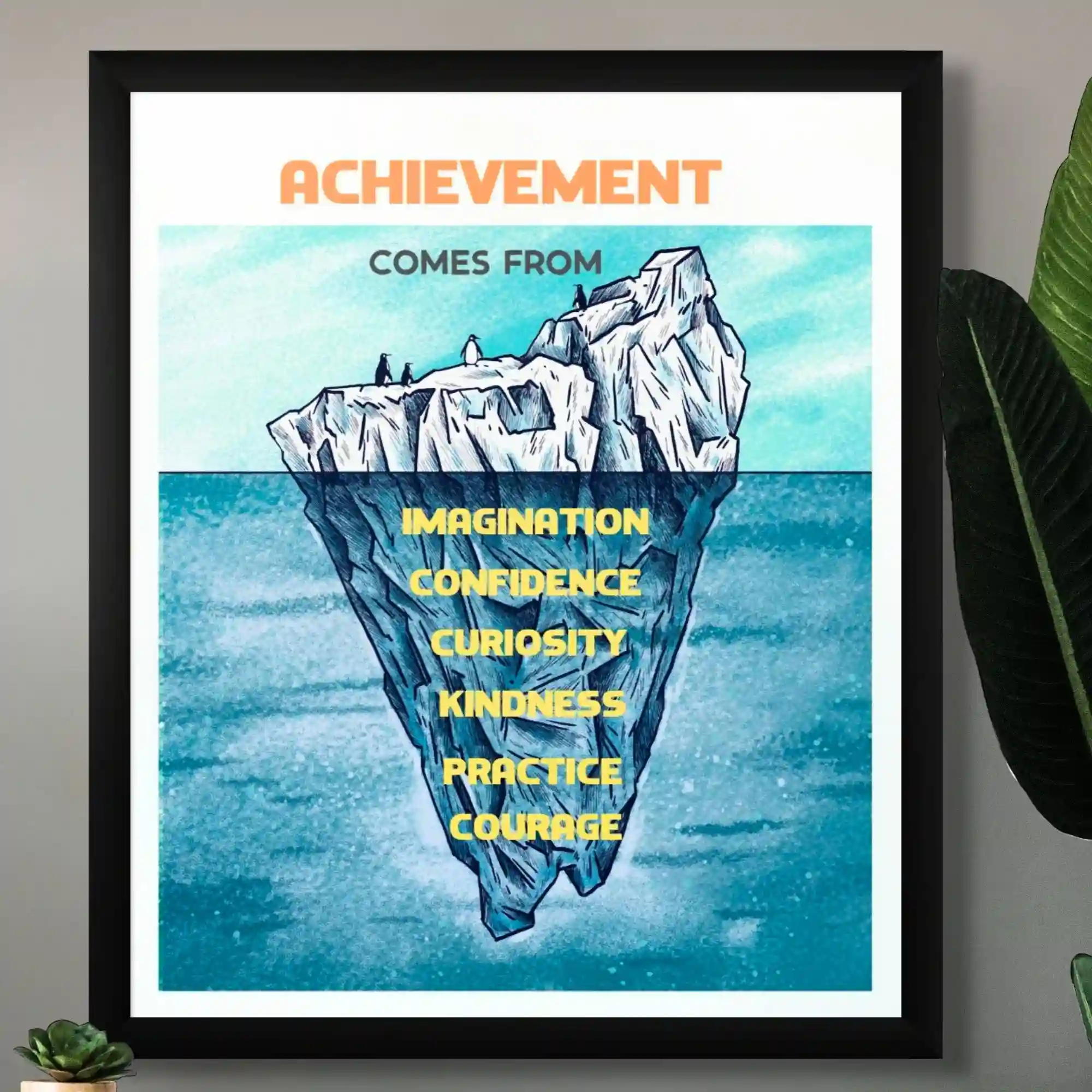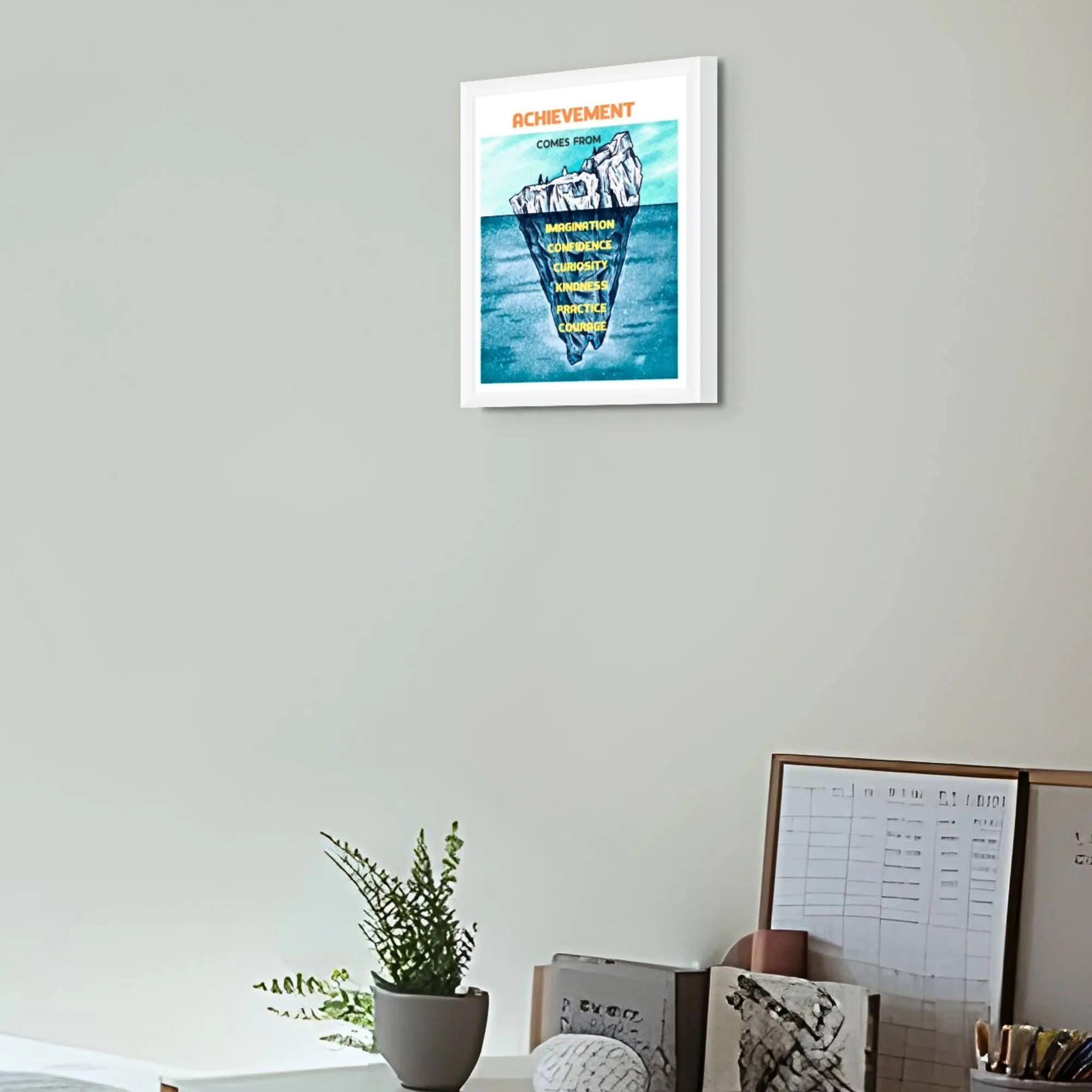 Unlock the secrets to achievement with this inspiring framed quote. It highlights the essential building blocks of success: imagination, confidence, curiosity, kindness, practice, and courage.