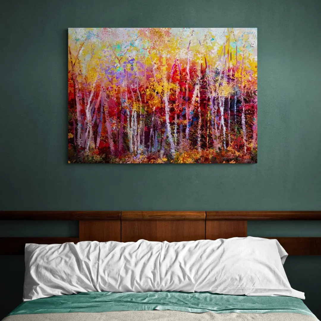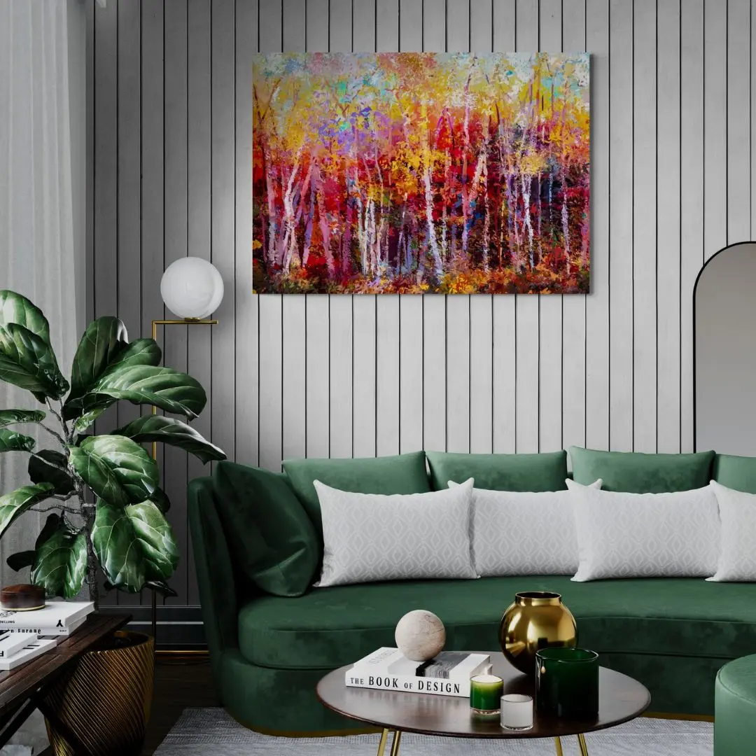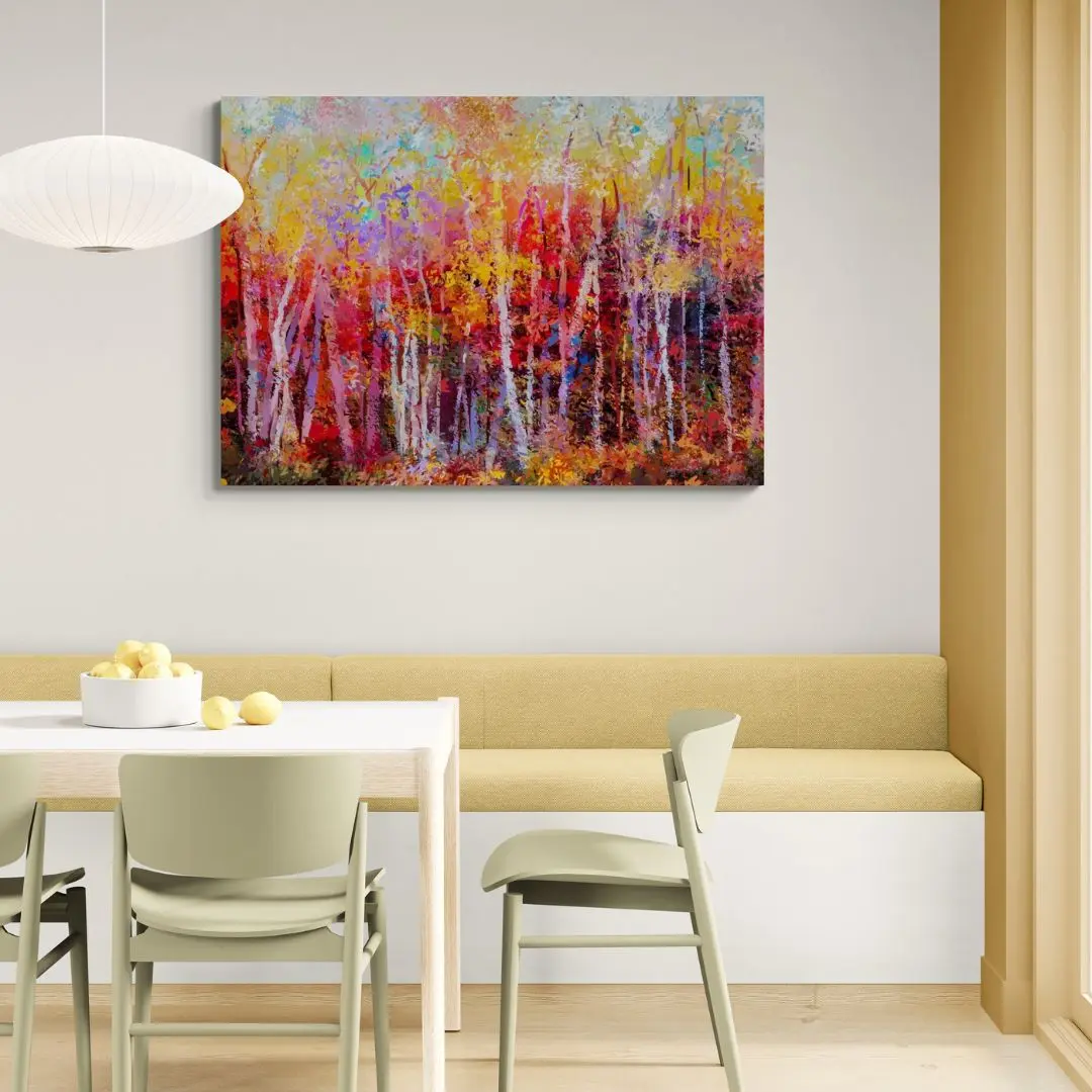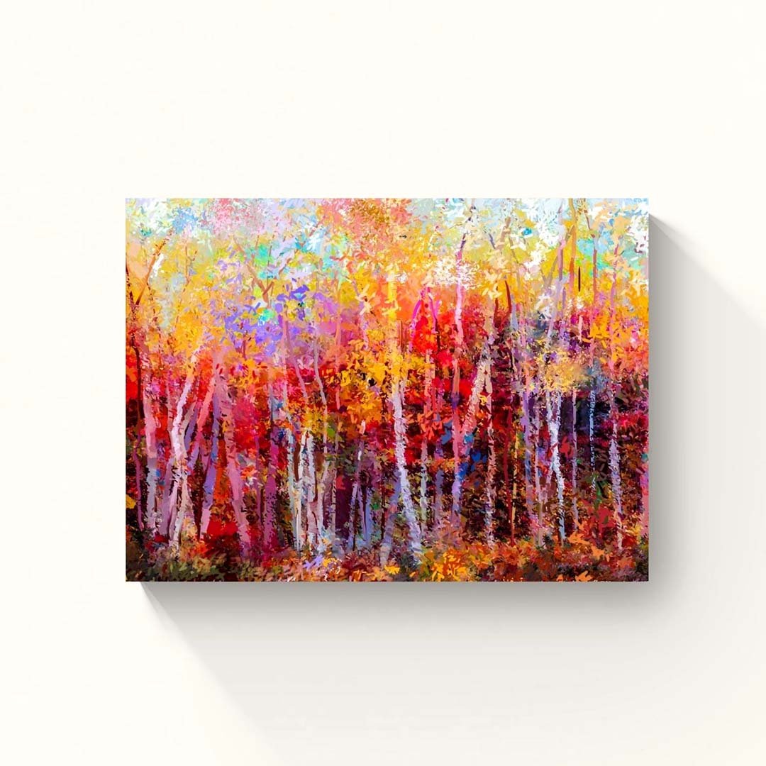 Autumn Forest is a striking abstract artwork inspired by the warmth of a fall woodland. Vertical strokes suggest towering trees, while rich reds, oranges, browns, and golden yellows capture a sunlit forest path. Textured, expressive brushwork adds depth, making it ideal for modern Indian interiors seeking warmth and character.