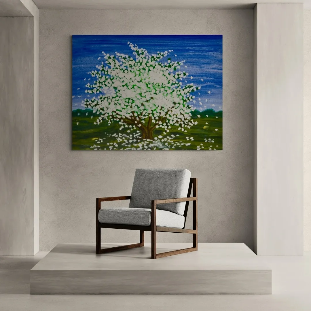 This vibrant painting captures the magic of springtime with a blossoming tree in full bloom against a clear blue sky. The profusion of white flowers creates a dreamy, cloud-like effect, symbolizing hope and new beginnings. The scattered petals on the green grass below add a touch of movement, as if a gentle breeze is blowing. The bright colours and cheerful mood make this artwork a perfect choice to bring freshness and positivity into your home or office.
