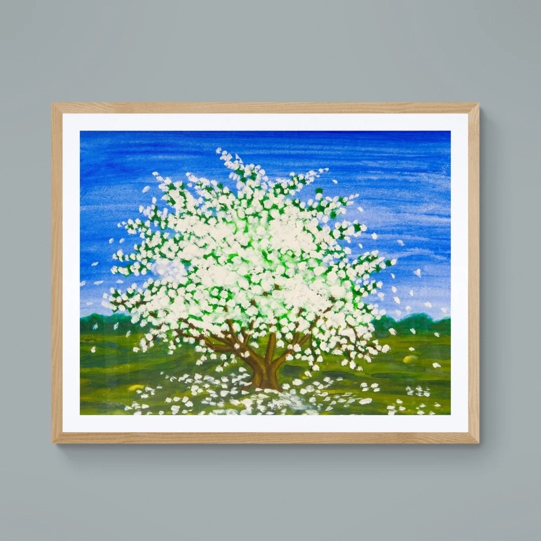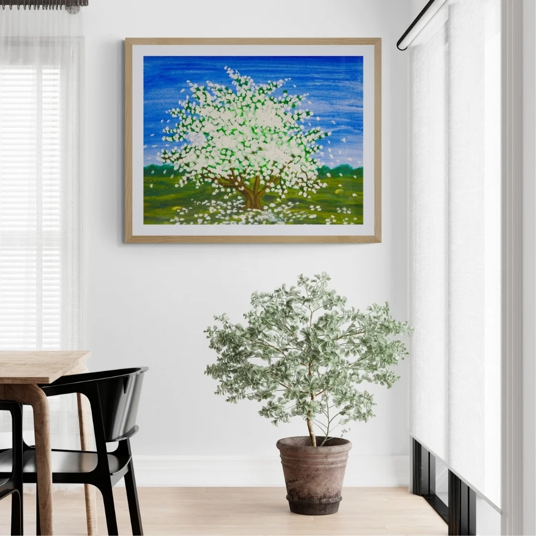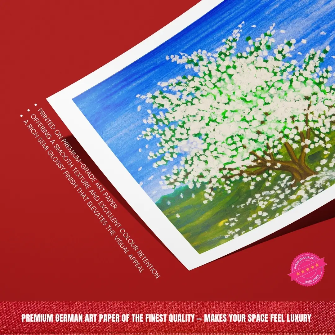 This vibrant painting captures the magic of springtime with a blossoming tree in full bloom against a clear blue sky. The profusion of white flowers creates a dreamy, cloud-like effect, symbolizing hope and new beginnings. The scattered petals on the green grass below add a touch of movement, as if a gentle breeze is blowing. The bright colours and cheerful mood make this artwork a perfect choice to bring freshness and positivity into your home or office.