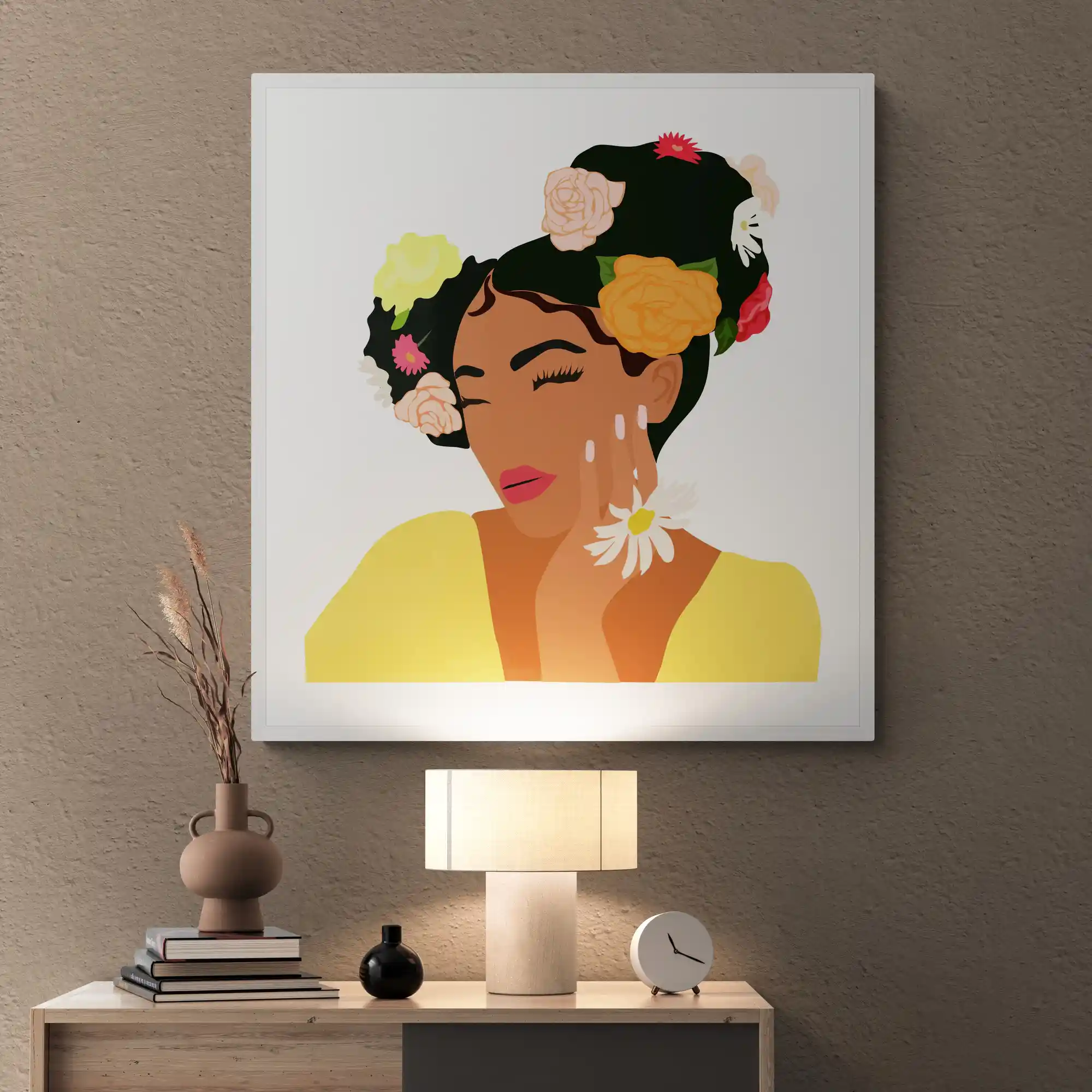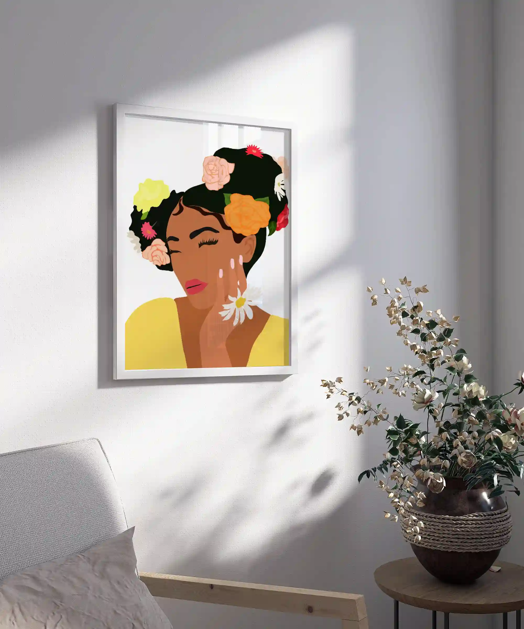 Celebrate self-expression with this stunning bohemian portrait of a joyful woman adorned with vibrant flowers. This minimalist illustration radiates positivity and natural beauty, using bold colours to brighten any room. “Blossoming Joy” is perfect for modern bohemian decor, uplifting spaces with warmth and serenity. Its vibrant design serves as a daily reminder to embrace happiness and the simple pleasures of life.