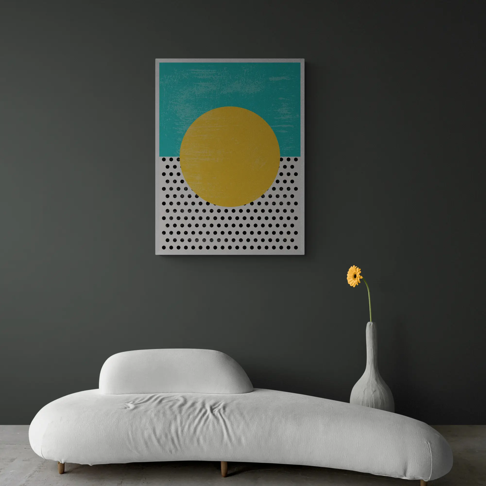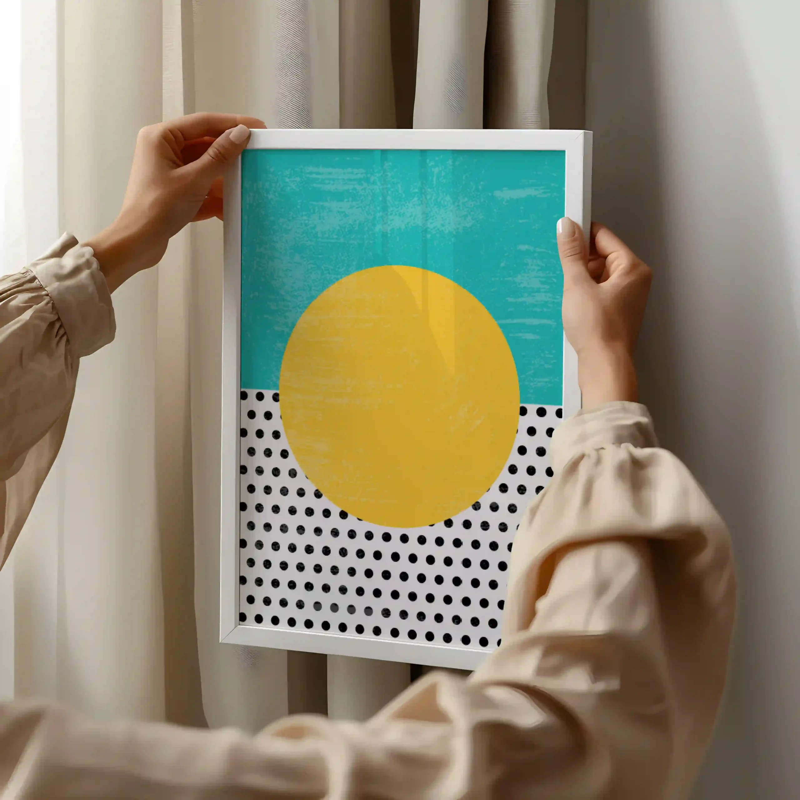 This framed artwork blends minimalism with a touch of grunge, featuring bold geometric shapes, a sun-like yellow circle, and contrasting polka dots against a teal sky. Its vibrant yet sophisticated design adds personality and depth, making it a striking addition to any modern or bohemian space.