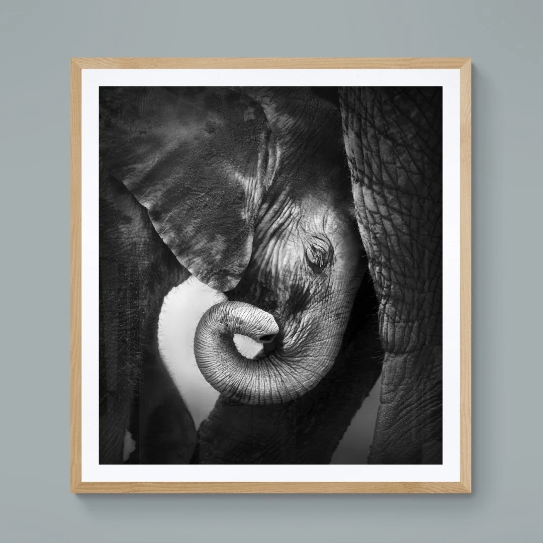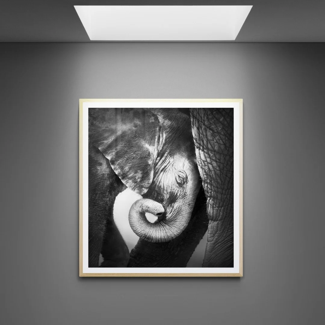This black-and-white artwork captures a moving moment between a baby elephant and its mother. The soft curves of the baby’s trunk and the mother’s protective stance express love, care, and safety. This image is ideal for any home or office; it reminds us of the beauty of family and nature. Its timeless style suits any space and adds a sense of calm and emotional connection to your walls. Include this beautiful piece in your collection and experience the warmth it brings every day.