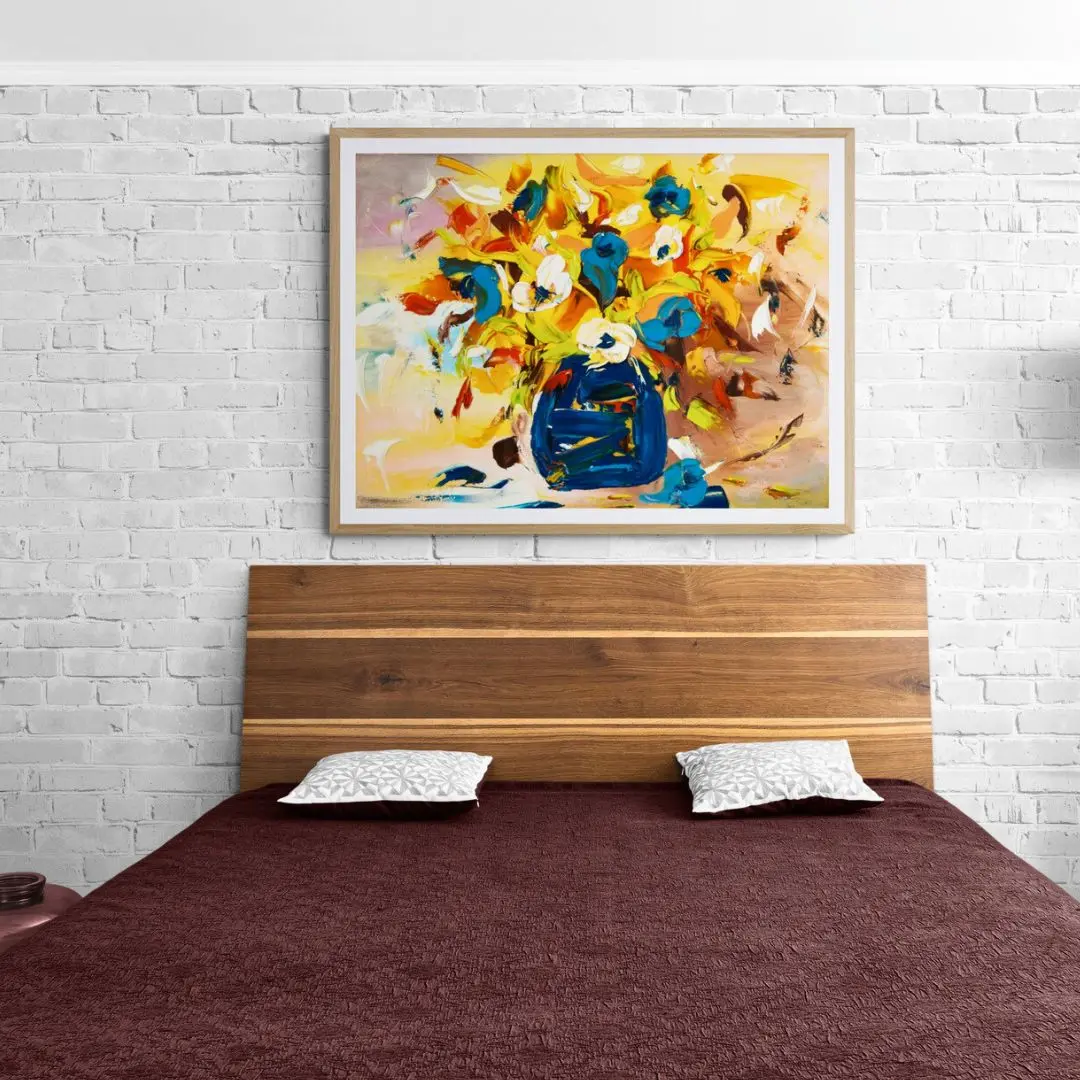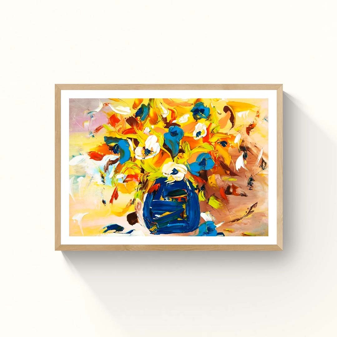This expressive painting features a vibrant bouquet in a bold blue vase, brought to life with loose, energetic brushstrokes. Rich reds, oranges, yellows, blues, and purples stand out against a softly blended abstract background. Full of warmth and movement, it symbolises nature, love, and new beginnings—perfect for uplifting any home or office space.
