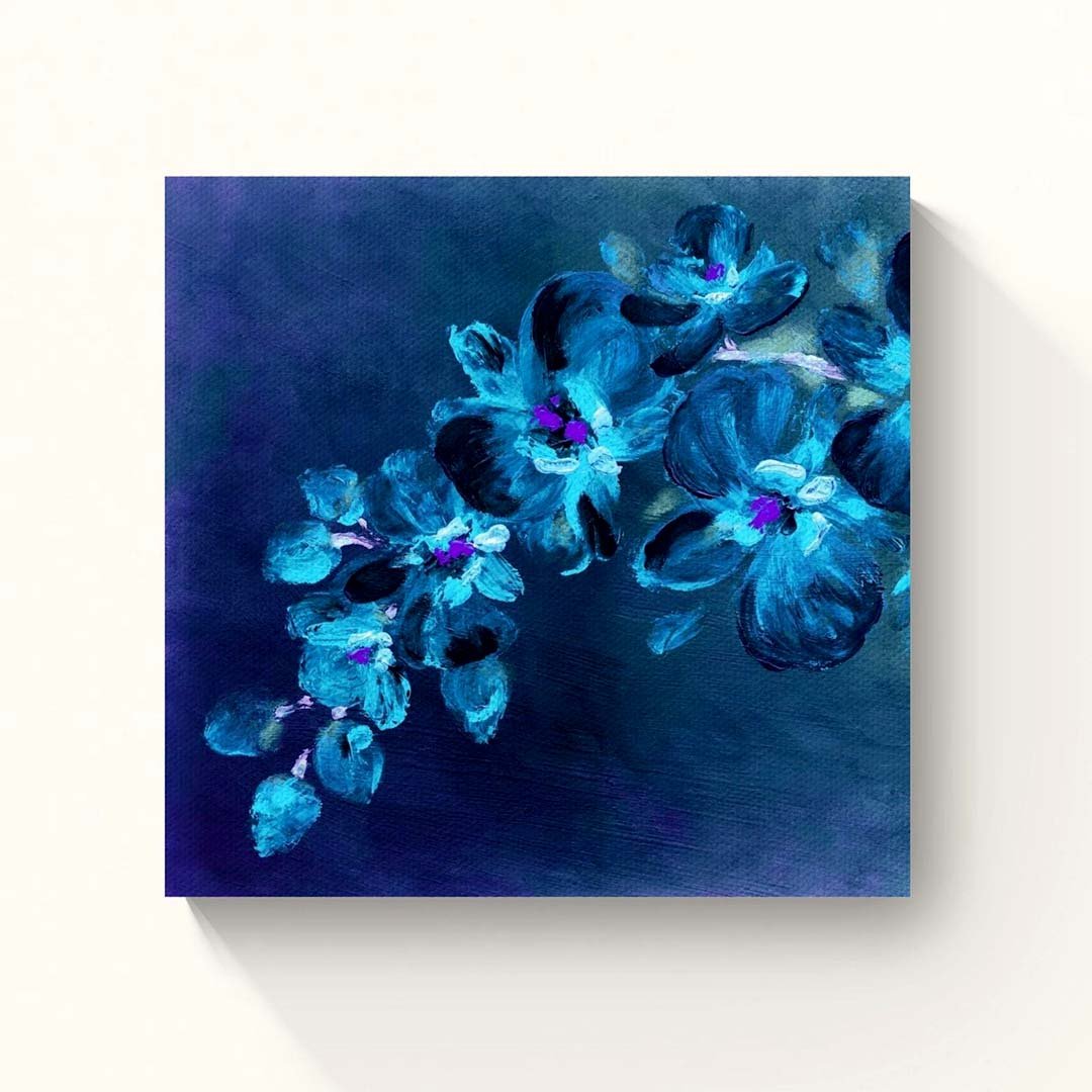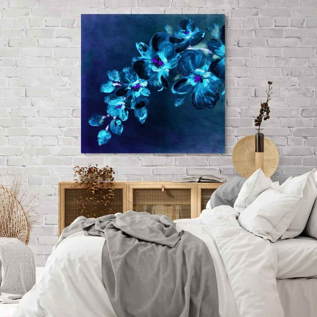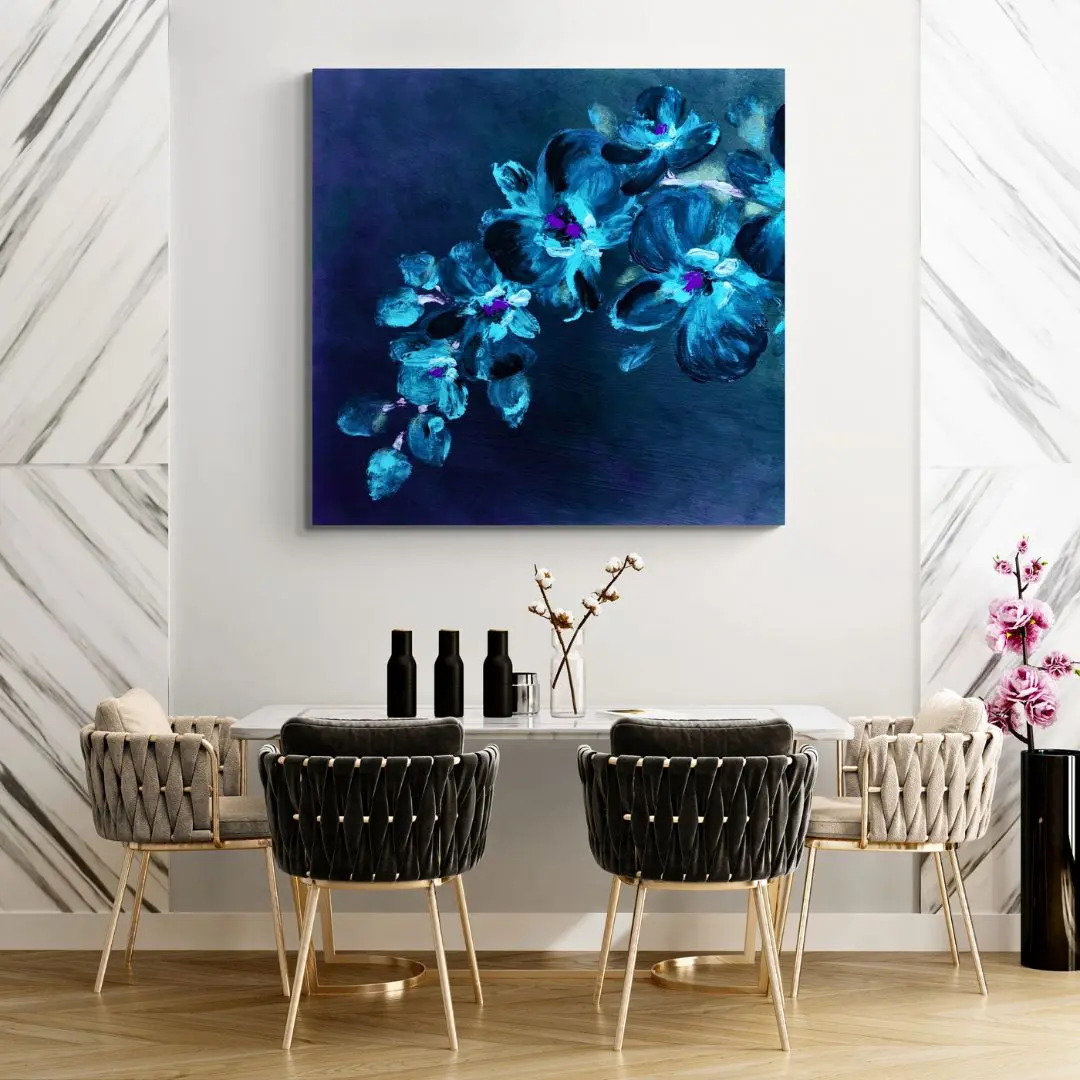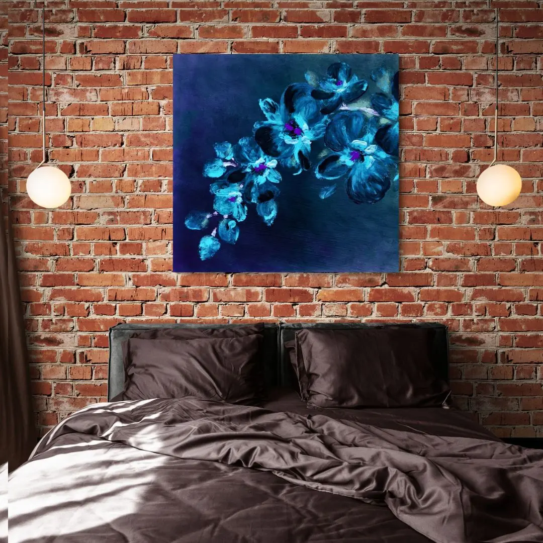 This elegant floral wall art features glowing, orchid-inspired blooms set against a deep, dramatic backdrop. Rich blue tones with subtle purple accents create a calm, luxurious mood. Its modern, oil-painted style adds mystery and sophistication, making it an ideal statement piece for living rooms, bedrooms, or refined office spaces.