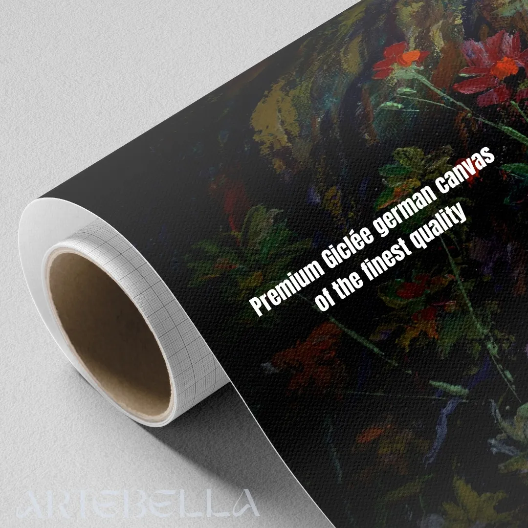 This enchanting painting captures the quiet beauty of glowing flowers under a dark, mysterious sky. The delicate trumpet-shaped blooms, with soft hints of red, orange, and pale green, seem to radiate their own light, creating a magical, dreamlike atmosphere. Set against a deep, shadowy background, the flowers symbolize hope and resilience, standing out in their luminous elegance. The smooth textures and flowing brushstrokes bring life and depth to the petals, while the subdued colours enhance the painting’s romantic and tranquil feel. Perfect for creating a serene and thoughtful ambiance, this artwork adds a touch of elegance and mystery to any space.