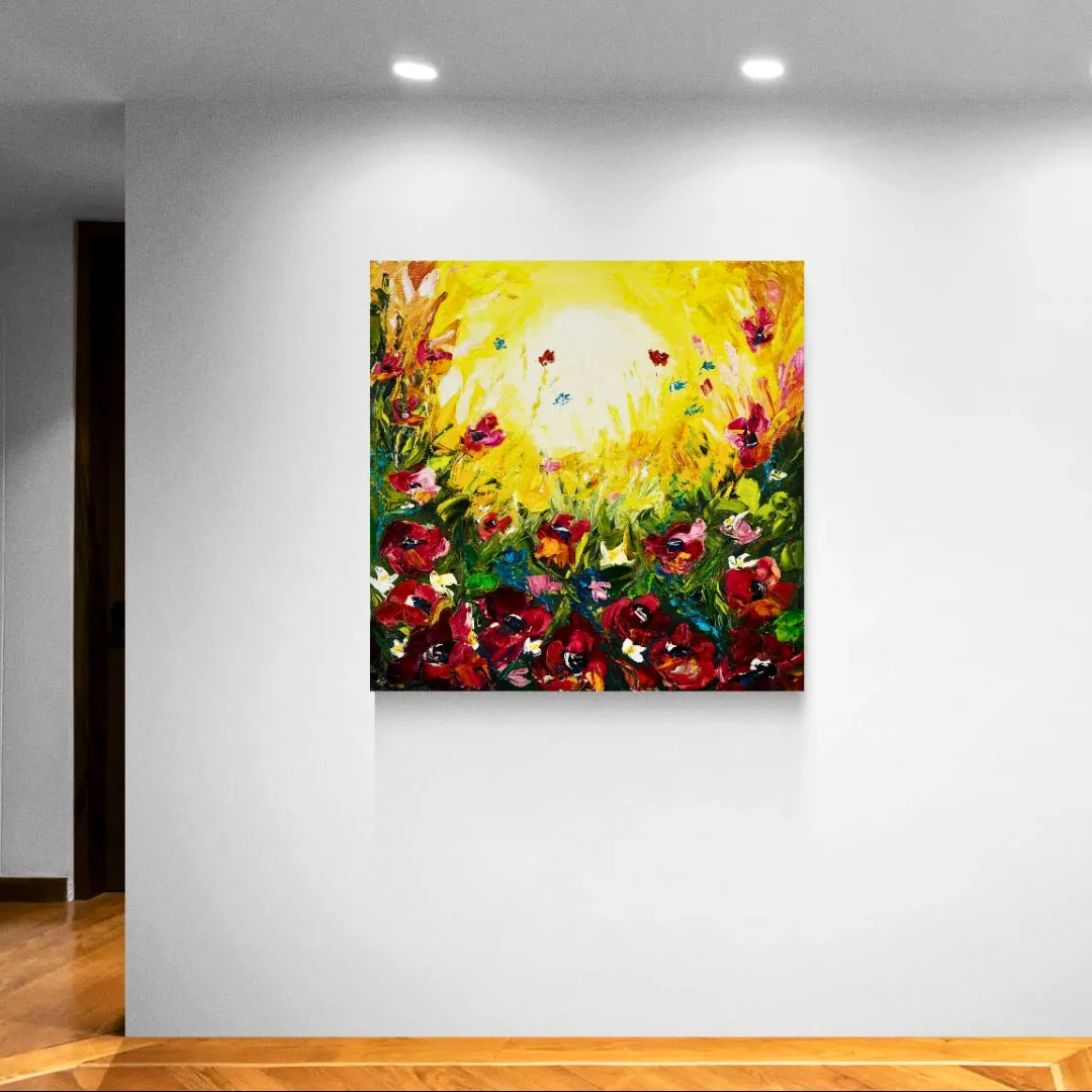 This vibrant painting captures the warmth and joy of a sunny summer day, with red poppies, yellow daisies, and blue forget-me-nots dancing across lush green fields. Loose brushstrokes create movement, while the glowing yellow sky fills the scene with light, hope, and uplifting energy—perfect for nature lovers and bright, cheerful interiors.
