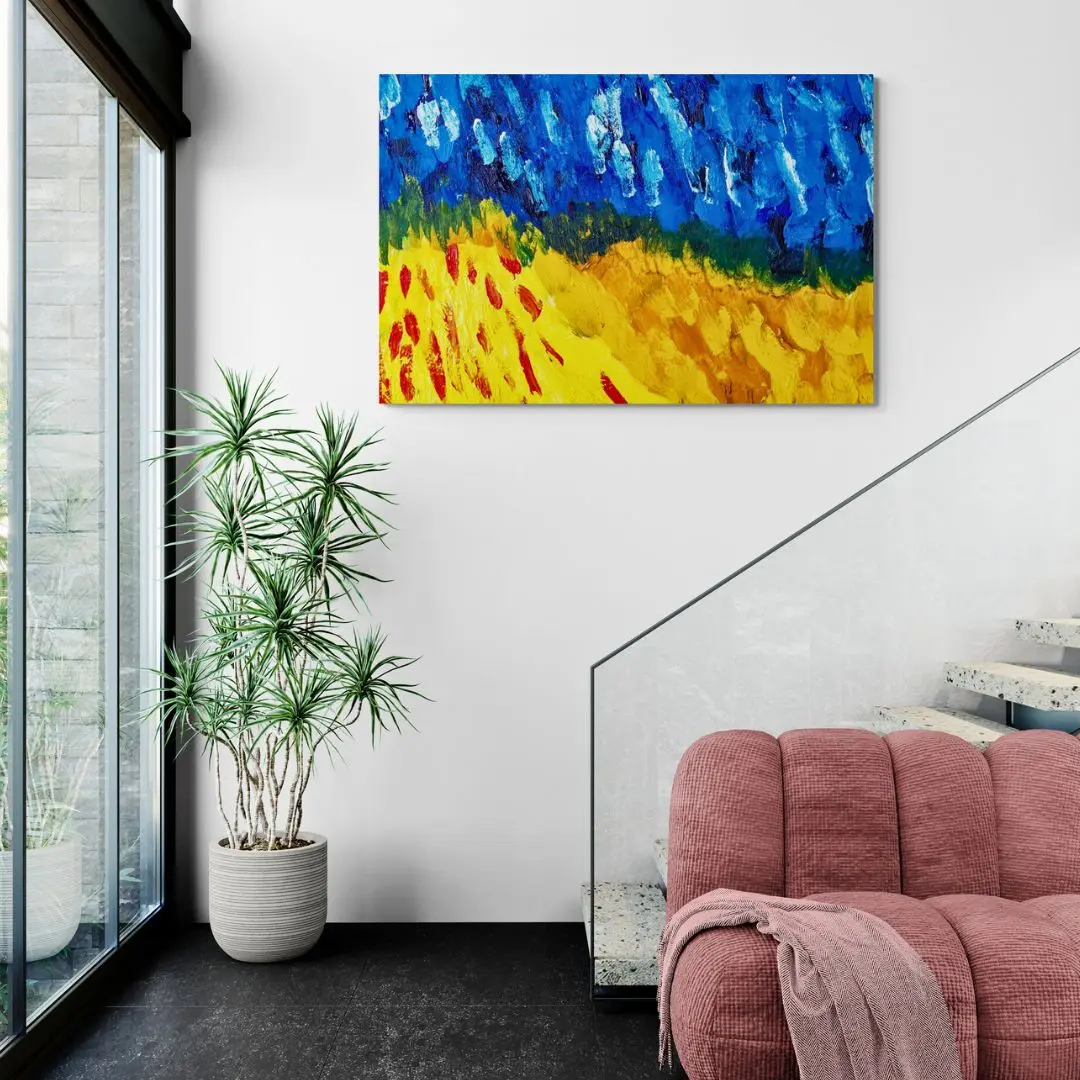 This mesmerizing abstract artwork blends deep blues with rich golden tones, divided horizontally for a calm yet dynamic composition. Thick textures and bold brushstrokes add depth and movement, evoking ocean and sky interpretations. Ideal for modern interiors, it brings expressive energy and a refined artistic presence to homes or office spaces.
