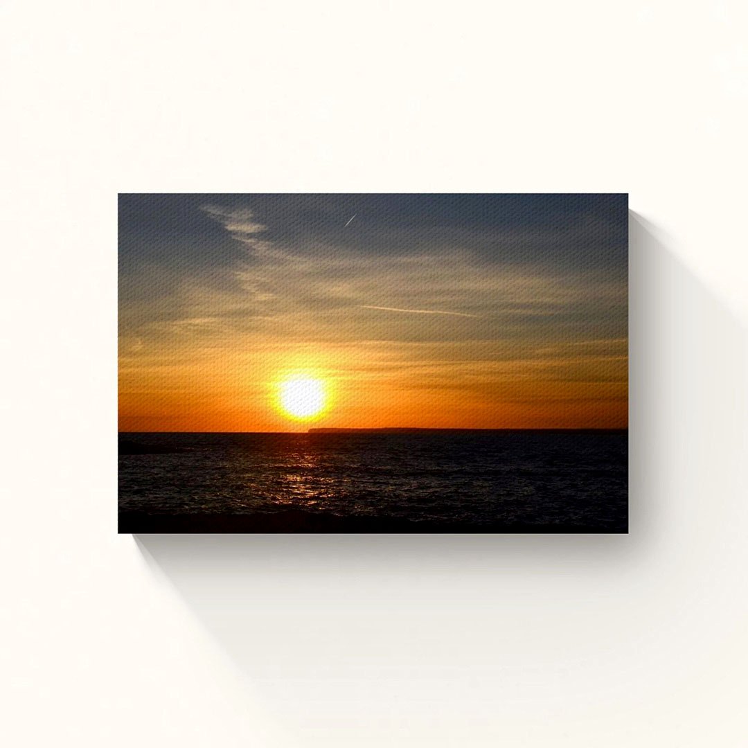 This artwork captures the calming beauty of a seaside sunset, with vibrant orange and yellow light reflecting across gentle ocean waters. Soft purples mark the transition from day to night, creating a warm, tranquil mood. Perfect for spaces that invite relaxation, it brings nature’s quiet elegance and soothing energy indoors.
