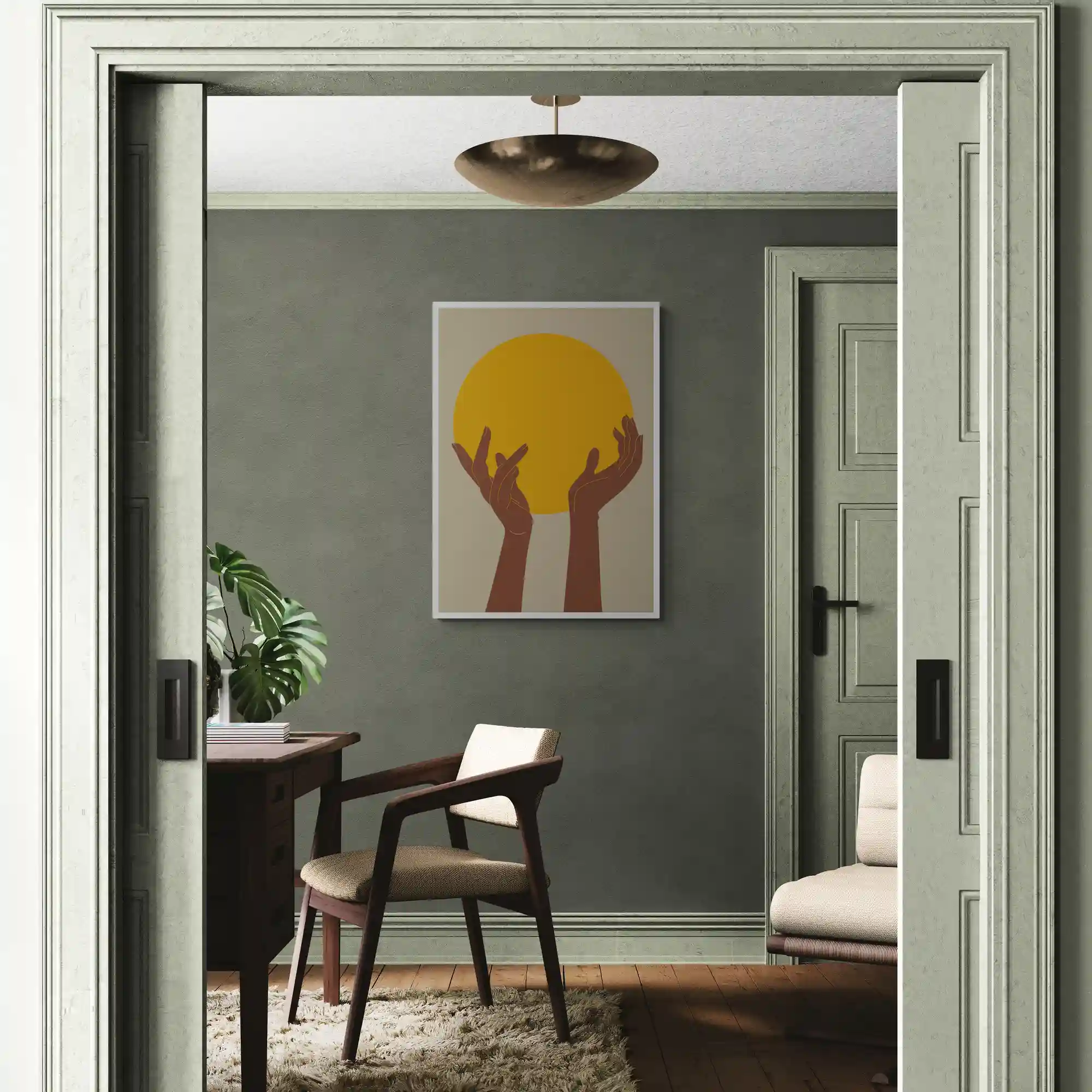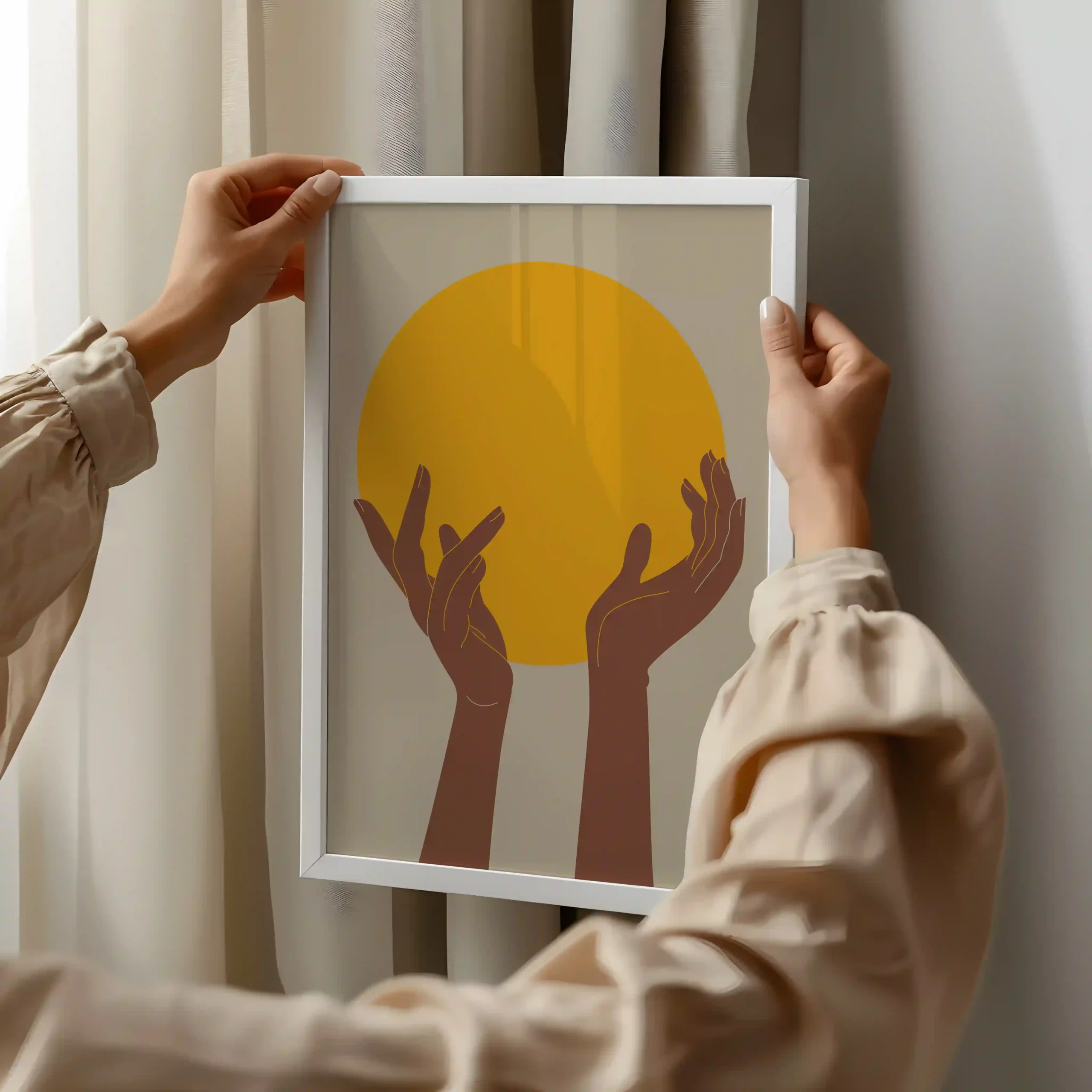This minimalist artwork features graceful hands and a retro-style sun, symbolizing balance, peace, and nature. With its boho look and warm golden colours, it adds a calm and relaxing feel to your space. Perfect for living rooms, bedrooms, or offices, it fits beautifully in modern, earthy, or eclectic interiors. A simple yet elegant piece that brings harmony to any room.