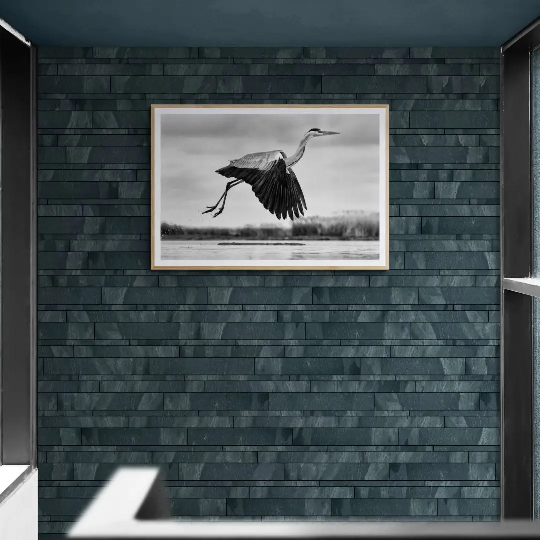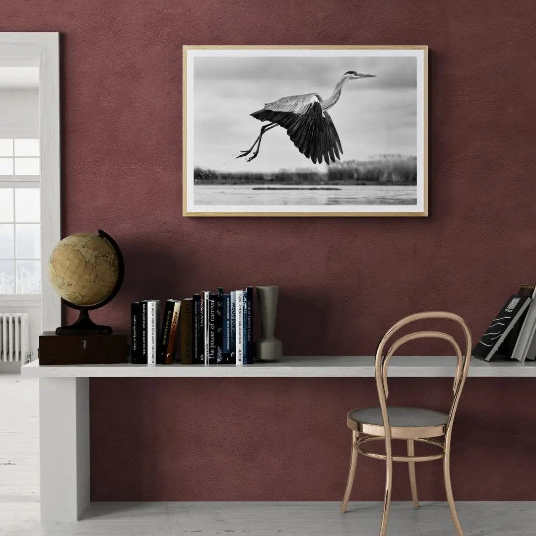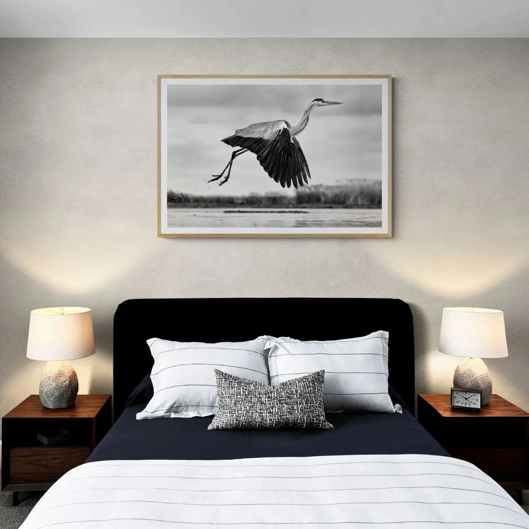 This elegant black-and-white wall art captures a heron in mid-flight, wings fully extended and legs trailing with grace. The blurred background adds depth and motion, while the monochrome tones highlight feather detail and form. Powerful yet serene, it brings timeless natural beauty and quiet sophistication to any space.