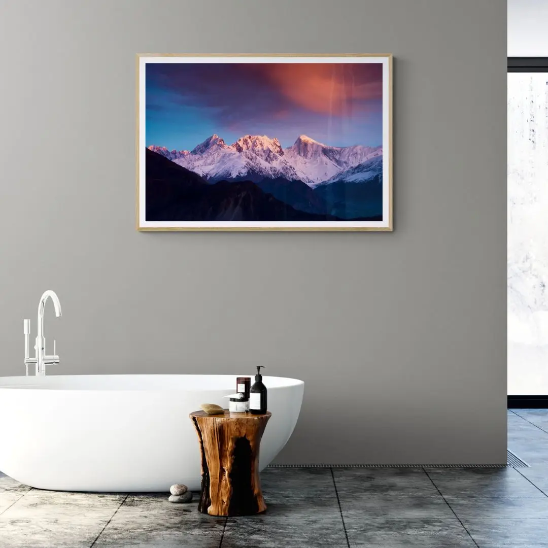 This stunning wall art captures a snow-capped mountain glowing under a dramatic sunrise or sunset. Fiery orange, soft pink, and deep blue tones light up the sky, while drifting clouds add mystery. The illuminated peaks reflect nature’s grandeur, making it perfect for nature lovers seeking serenity and awe in their space.