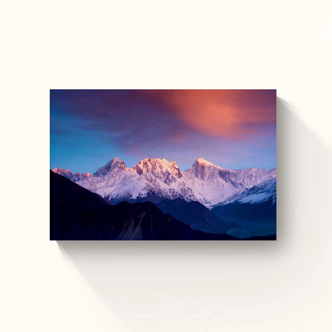 This stunning wall art captures a snow-capped mountain glowing under a dramatic sunrise or sunset. Fiery orange, soft pink, and deep blue tones light up the sky, while drifting clouds add mystery. The illuminated peaks reflect nature’s grandeur, making it perfect for nature lovers seeking serenity and awe in their space.