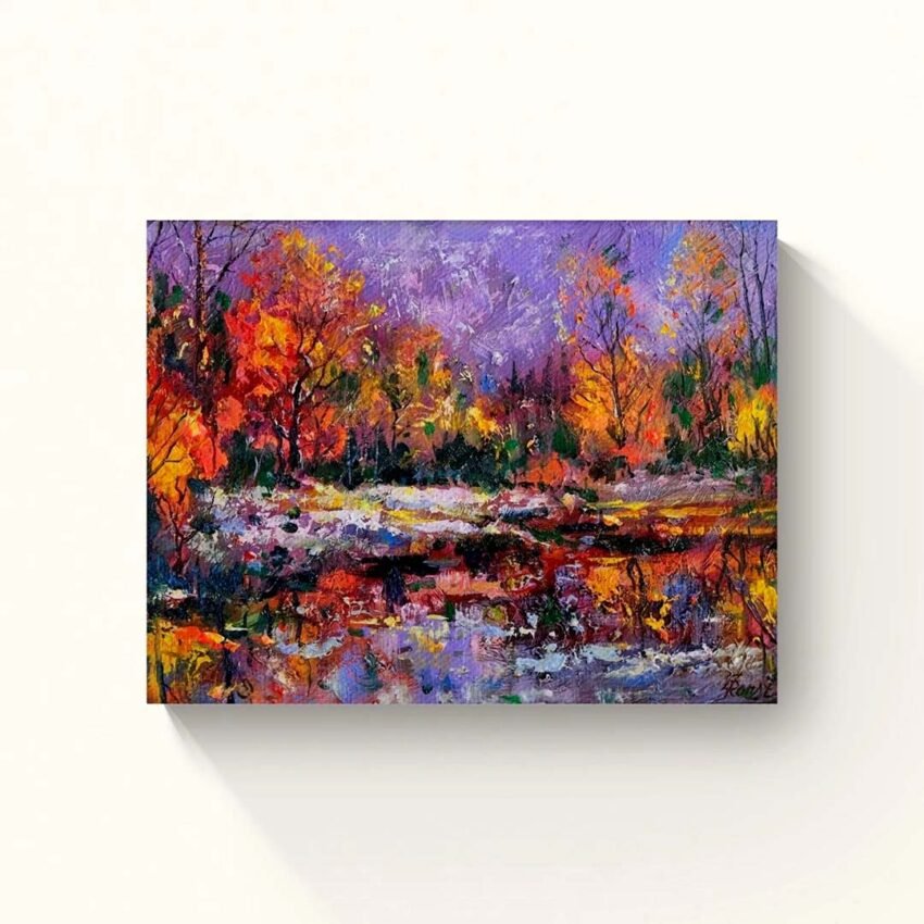 Serene Reflections is a calming abstract landscape inspired by the gentle shift from autumn to winter. Bare trees mirrored on still water create balance and quiet depth, enhanced by textured brushstrokes. Earthy browns, oranges, yellows, and subtle purples blend harmoniously, making it ideal for modern Indian homes seeking a reflective, tranquil atmosphere.