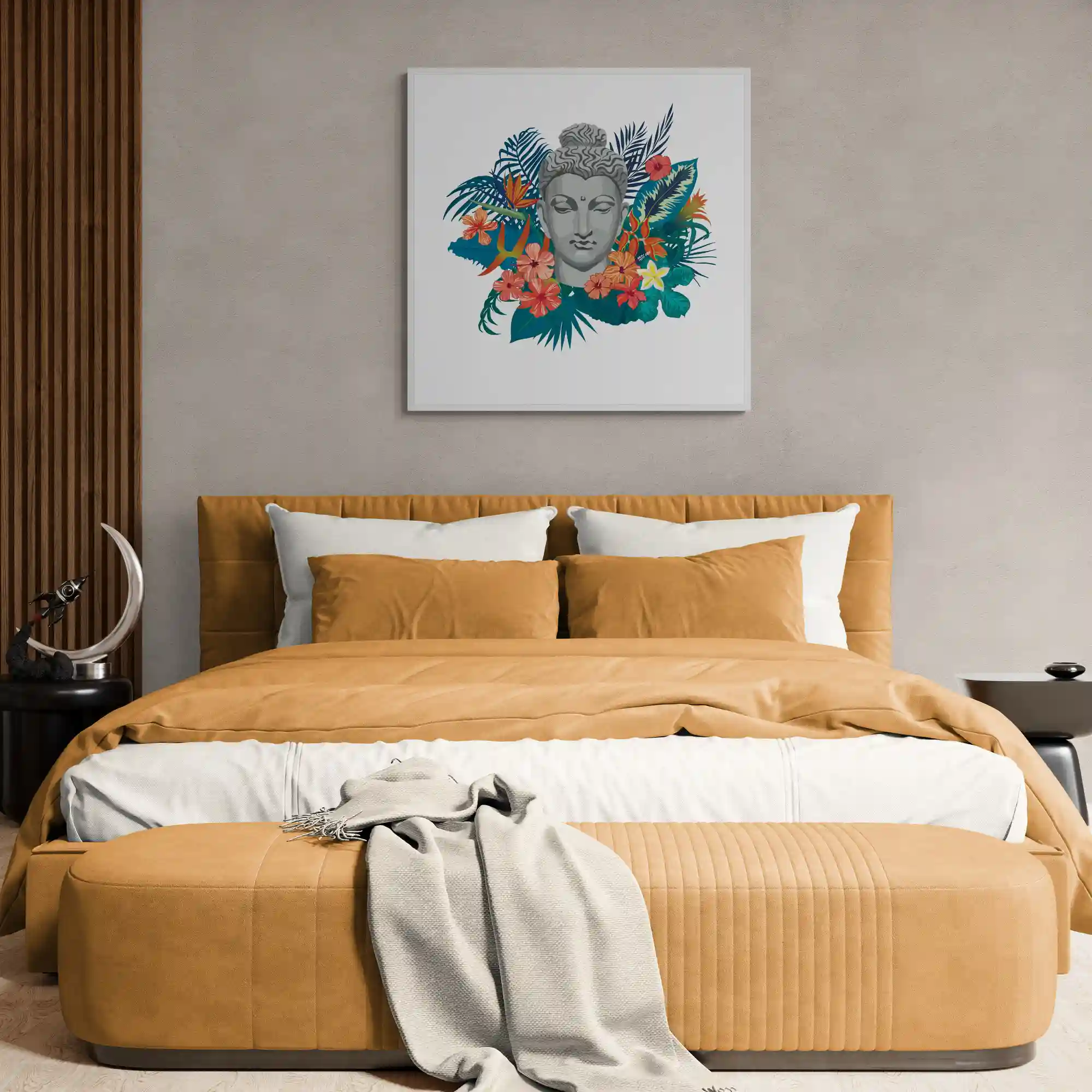 Experience calm with Serenity in Bloom, a Buddha-inspired artwork surrounded by vibrant tropical flowers and lush greenery. This minimalist bohemian piece blends spirituality and nature, bringing peace and mindfulness to any space. The Buddha’s gentle expression, reminds us to find inner calm in life’s vibrant moments. Perfect for meditation areas or living rooms, this framed art adds harmony and a soulful touch to your decor.