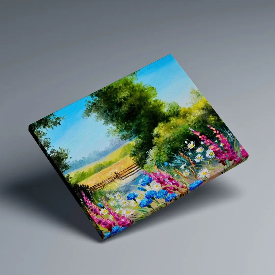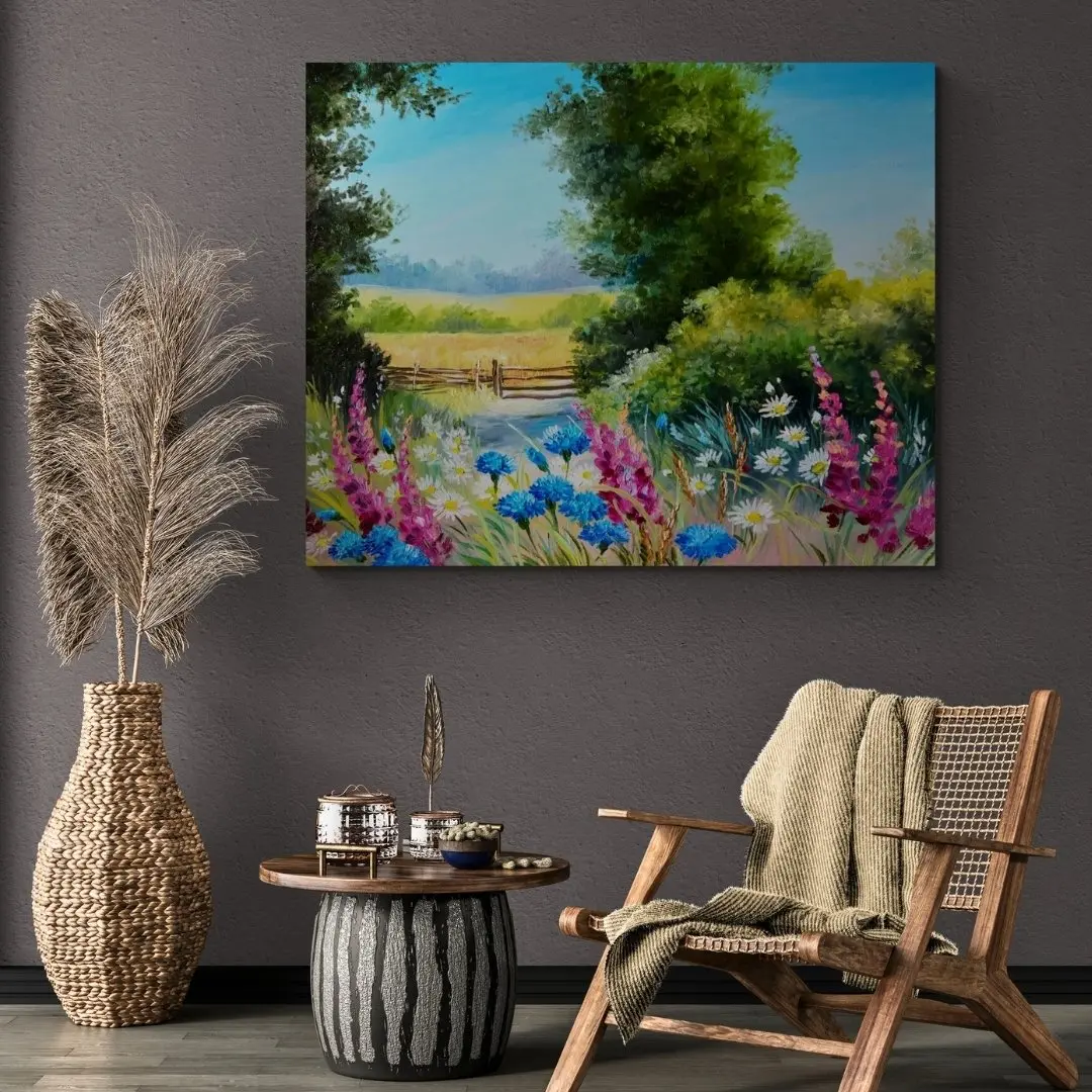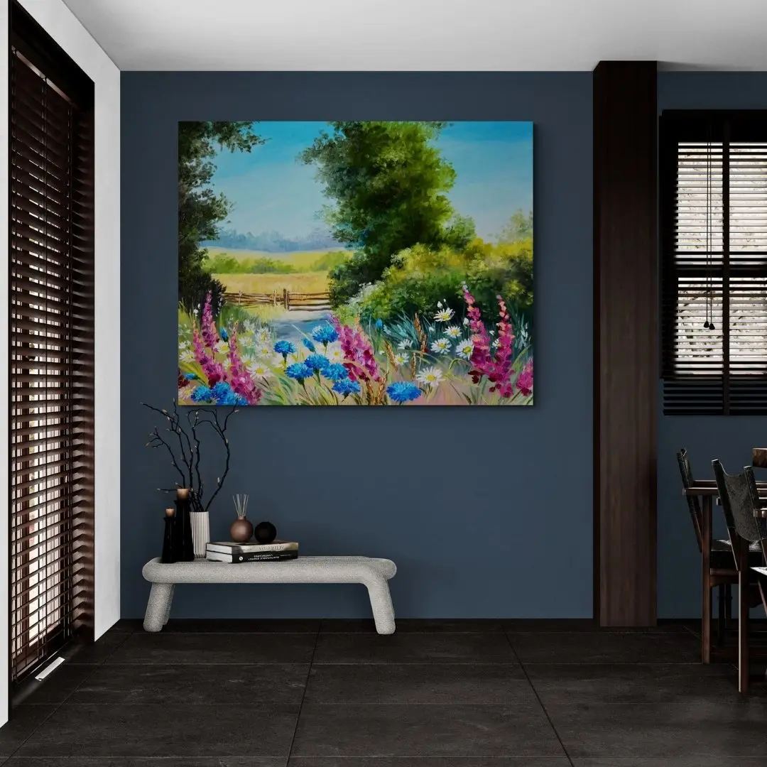 This gorgeous landscape artwork will bring the serene beauty of nature into your house. The “Tranquil Pathway” is a meandering path that winds through verdant fields with softly lit trees and blooming plants all around. The vivid colours and expressive brushstrokes produce a calm, calming ambiance that is ideal for bringing coziness and charm to your living room, bedroom, hallway, or office. Joy, nostalgia, and a strong bond with nature are evoked by the harmonious tones and textured details. Regardless of your preference for sophisticated landscape art or décor inspired by nature, this canvas painting brings a calm, revitalizing element to any area. A lovely option for contemporary Indian homes that want to incorporate nature into their walls.