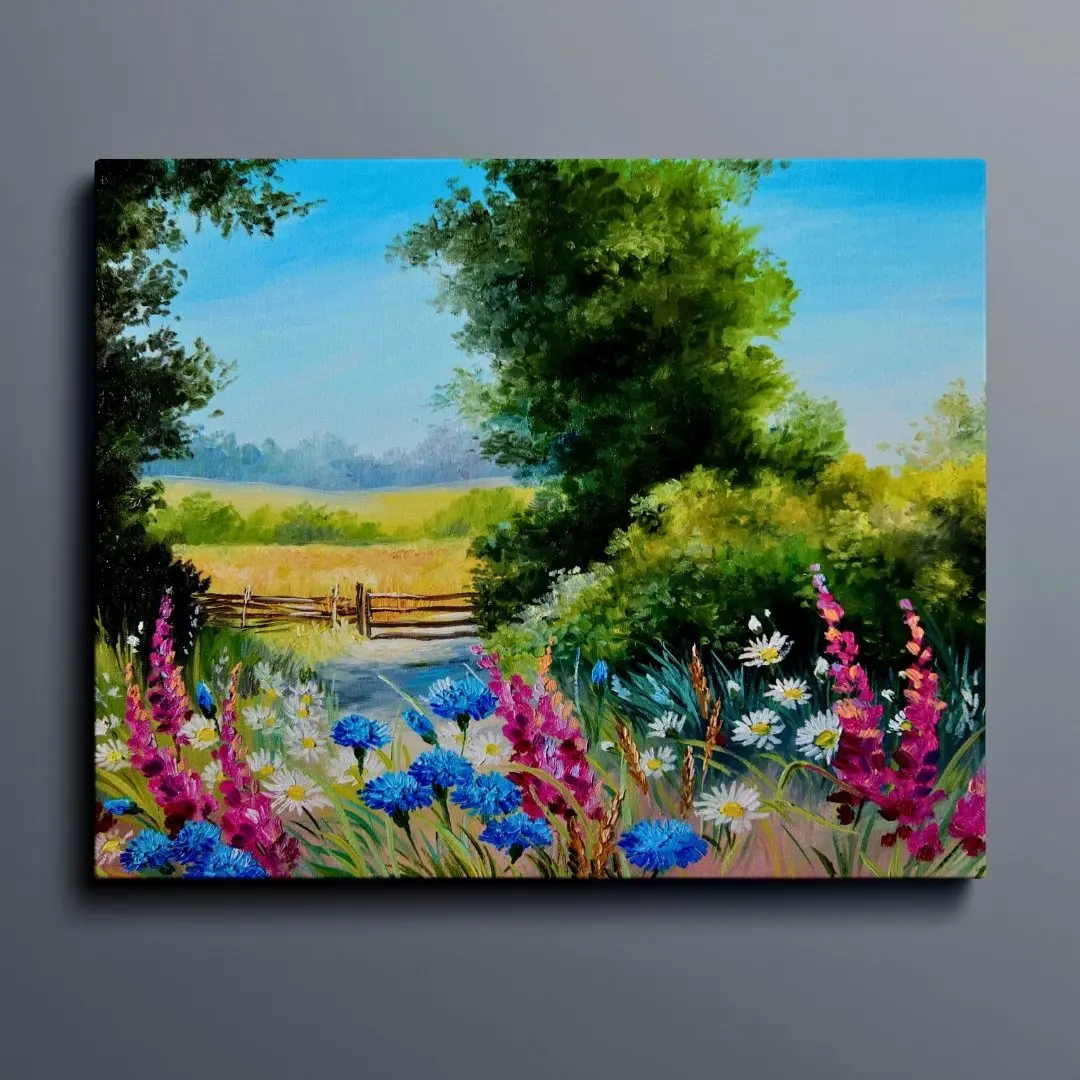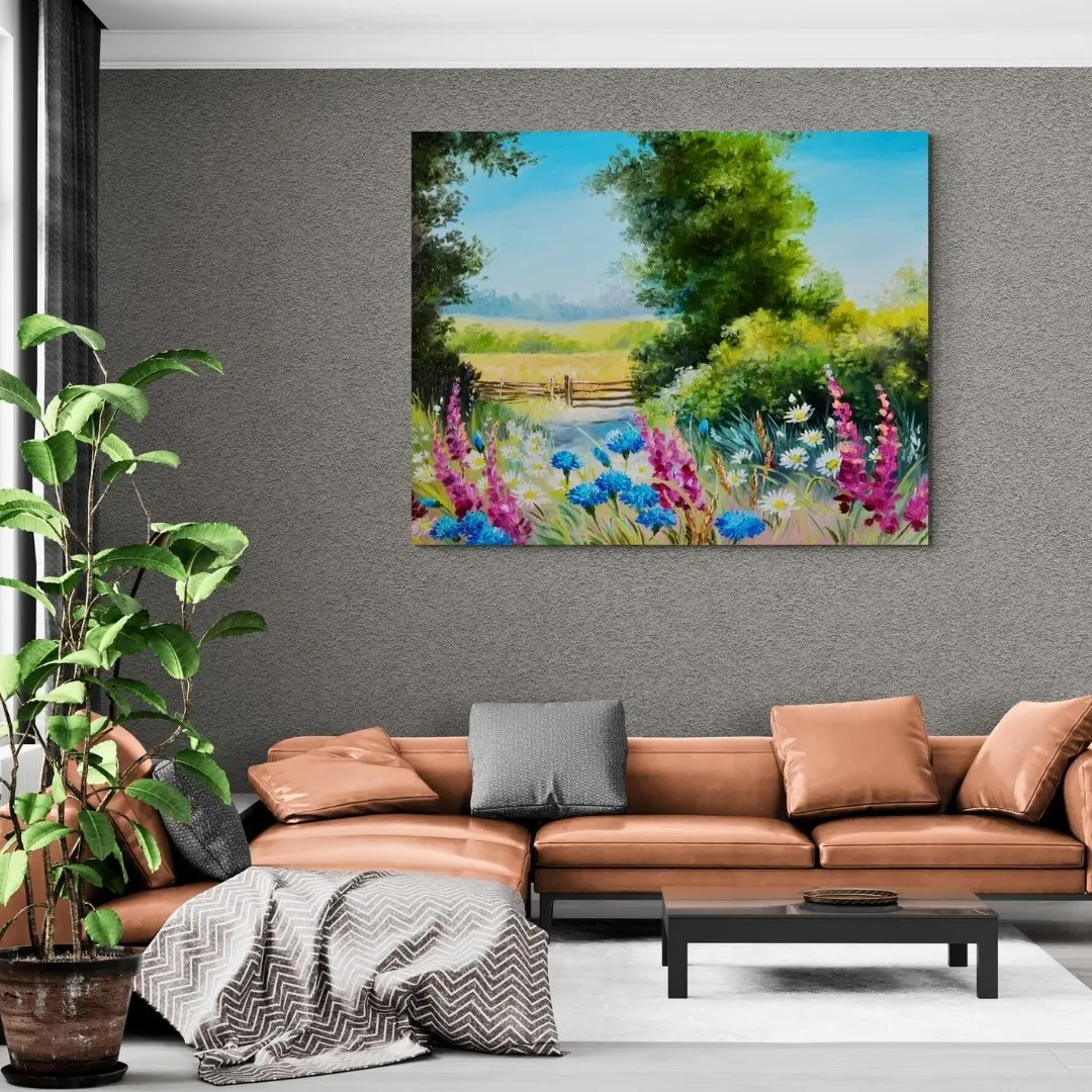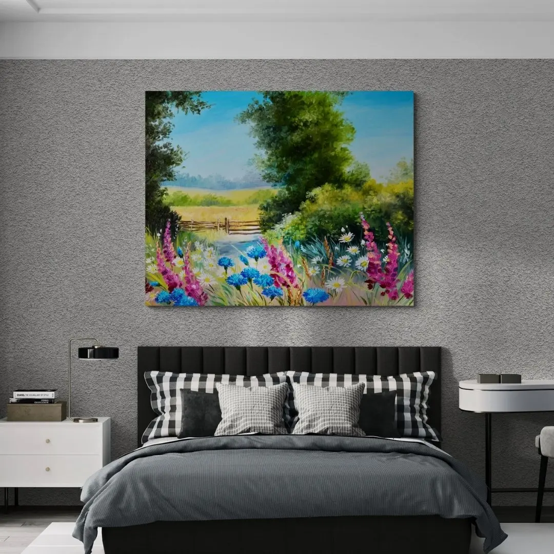 This gorgeous landscape artwork will bring the serene beauty of nature into your house. The “Tranquil Pathway” is a meandering path that winds through verdant fields with softly lit trees and blooming plants all around. The vivid colours and expressive brushstrokes produce a calm, calming ambiance that is ideal for bringing coziness and charm to your living room, bedroom, hallway, or office. Joy, nostalgia, and a strong bond with nature are evoked by the harmonious tones and textured details. Regardless of your preference for sophisticated landscape art or décor inspired by nature, this canvas painting brings a calm, revitalizing element to any area. A lovely option for contemporary Indian homes that want to incorporate nature into their walls.