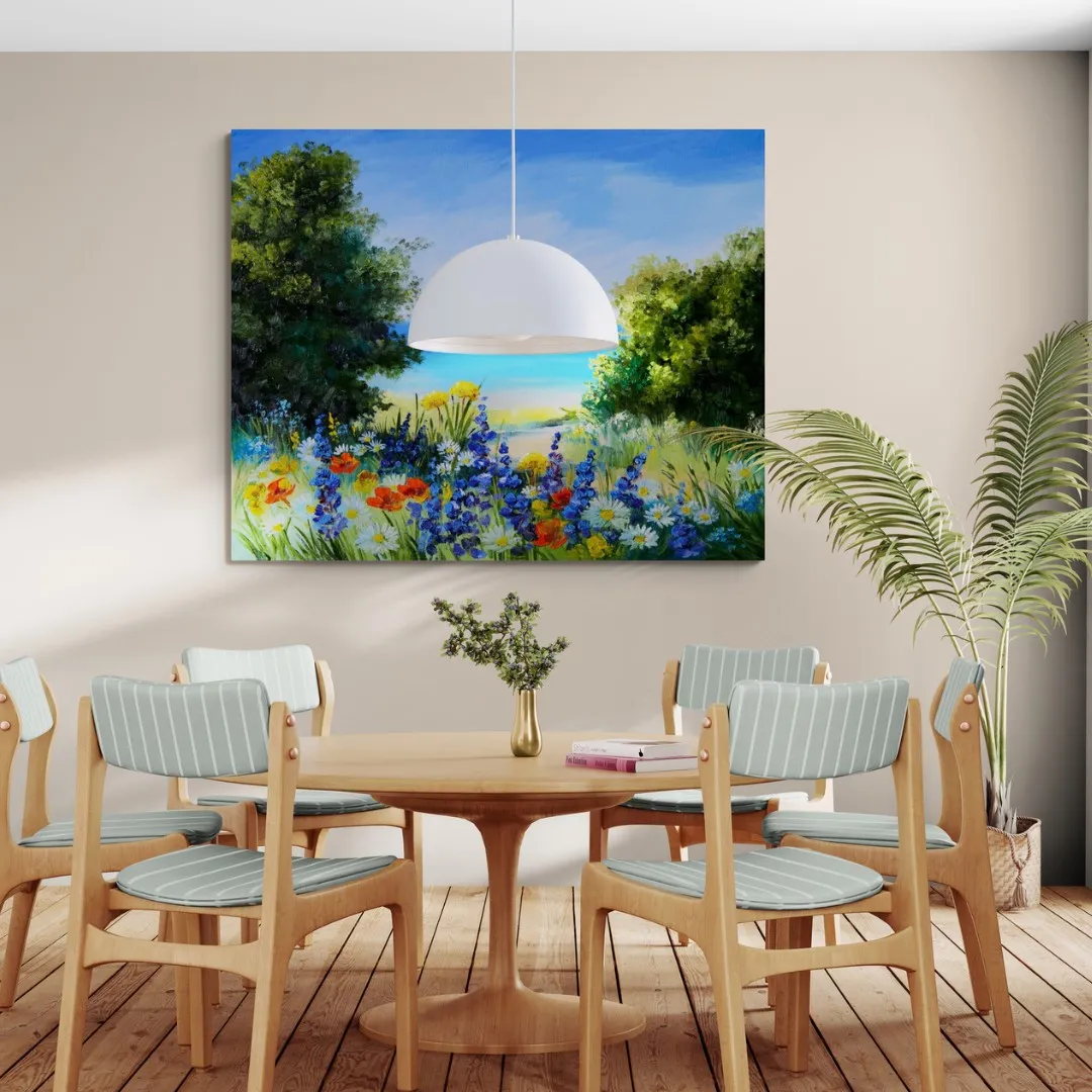 This breathtaking painting captures the beauty of nature with a vibrant field of wildflowers leading to a tranquil beach. A winding path invites you to explore the colourful meadow filled with daisies, poppies, and lupines. Framed by two graceful trees, the scene opens up to a shimmering blue ocean under a bright, clear sky. This artwork symbolizes peace, harmony, and new beginnings, bringing the joy of a summer day by the sea into your home. Perfect for creating a calming and inspiring atmosphere in any room.