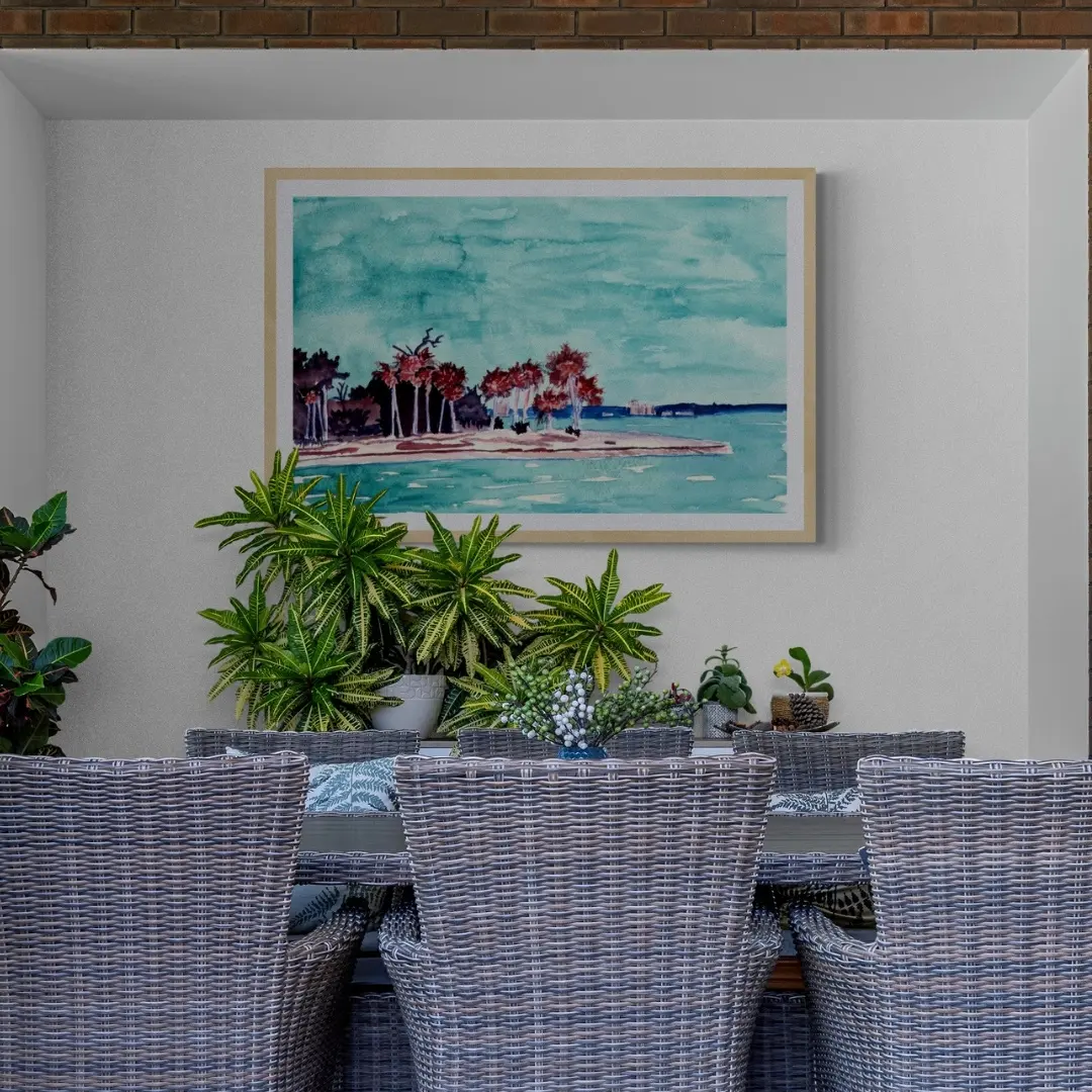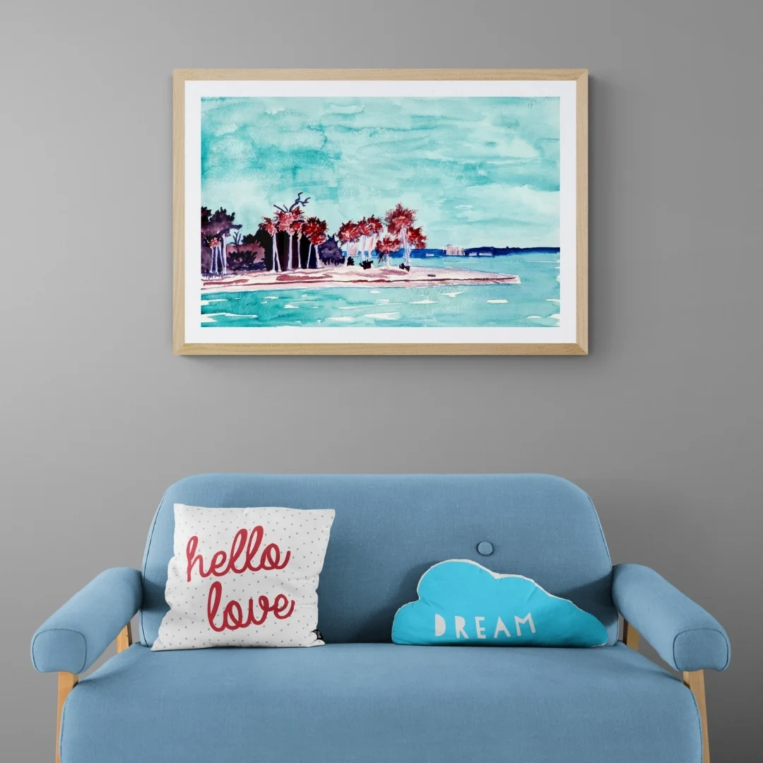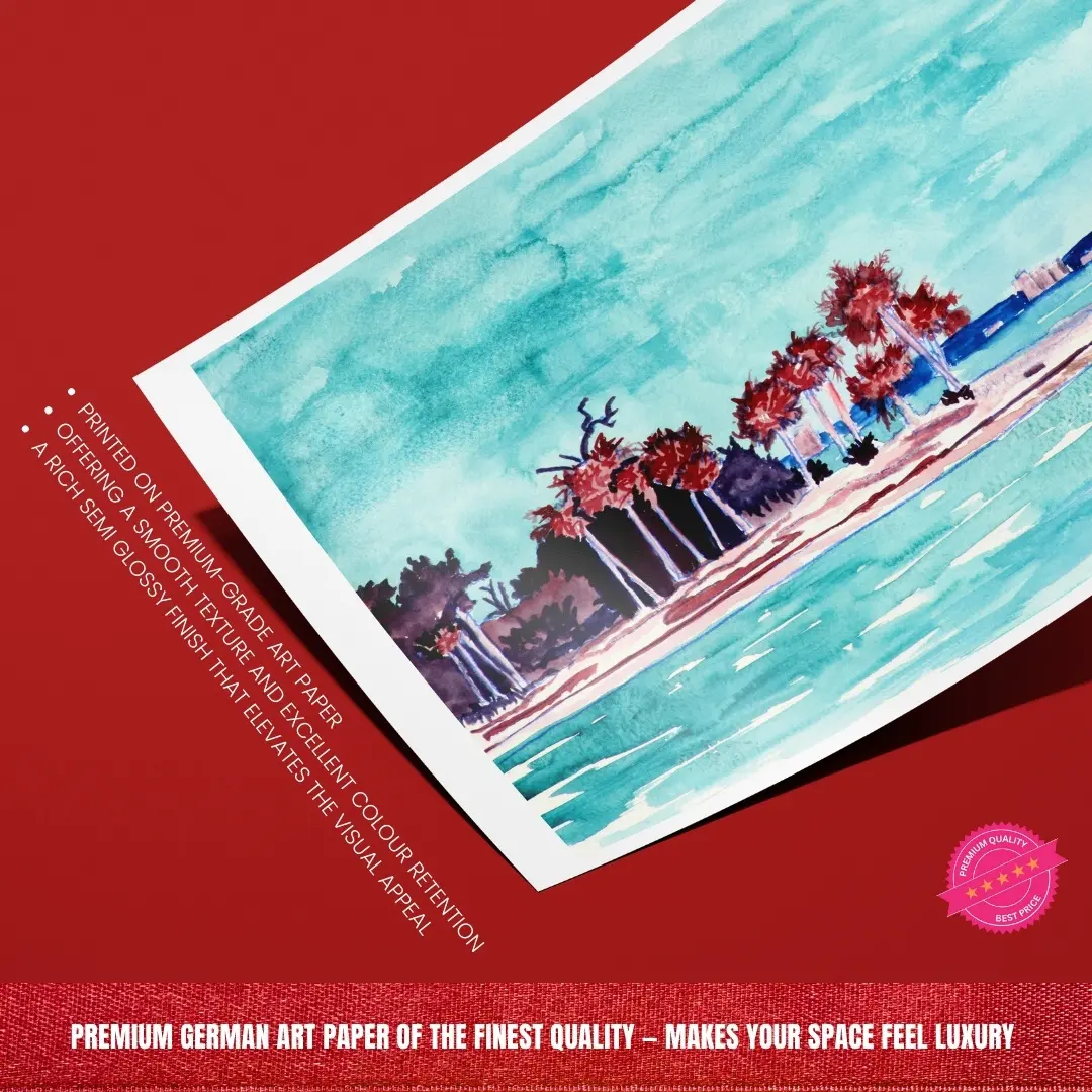 Escape into the soothing beauty of “Tranquil Shores,” an exquisite watercolour painting of a peaceful coastal haven with verdant trees, lapping waters and a slumberous turquoise sky. The harmony of the warm reds and cool blues has made it a symbol of peace and tranquillity – a fitting focal piece for any room in your home. Perfect for anyone who loves the peace and quiet of the great outdoors and want to feel a little closer to the seaside in their living room or workspace. Let this work of art take you to a place of reflection and rest.