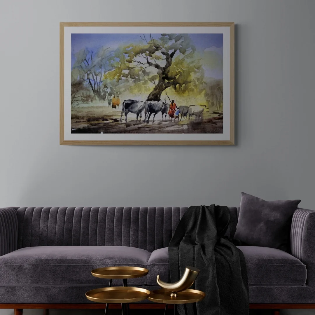 The breathtaking piece of art depicts a tranquil countryside landscape. Villagers are seen resting underneath a large banyan tree where the cattle are. The gentle and warm colours evoke a sensation of tranquillity and nostalgia. Calming strokes of the brush capture nature’s quiet beauty which depicts simpler times. This framed canvas piece can be placed in any room as it gives the room a classic touch. Add some charm of the rural life and a touch of calmness of the countryside to your home.