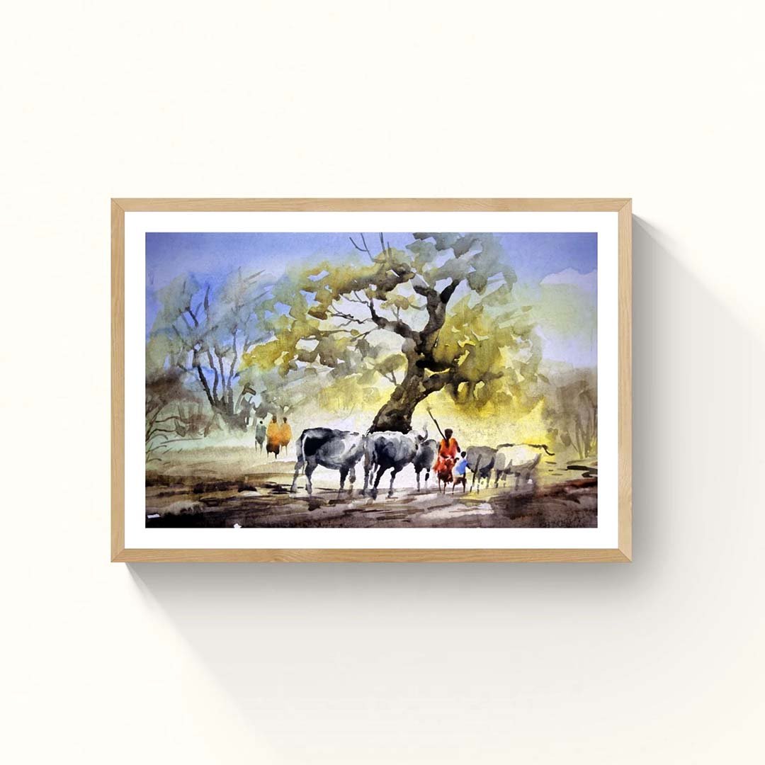 This captivating artwork portrays a tranquil countryside scene, with villagers resting beneath a grand banyan tree alongside cattle. Warm, gentle tones and soft brushstrokes evoke nostalgia and peace, reflecting the charm of rural life. Timeless and calming, this framed canvas adds classic elegance and a soothing countryside presence to any room.
