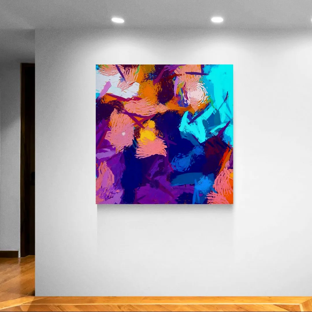This vibrant abstract artwork features overlapping textured shapes in bold pinks, oranges, purples, blues, and yellows. With no single focal point, it invites exploration and movement. Playful yet modern, the lively composition adds energy and a contemporary edge, making it ideal for creative living rooms, offices, or art-filled interiors.