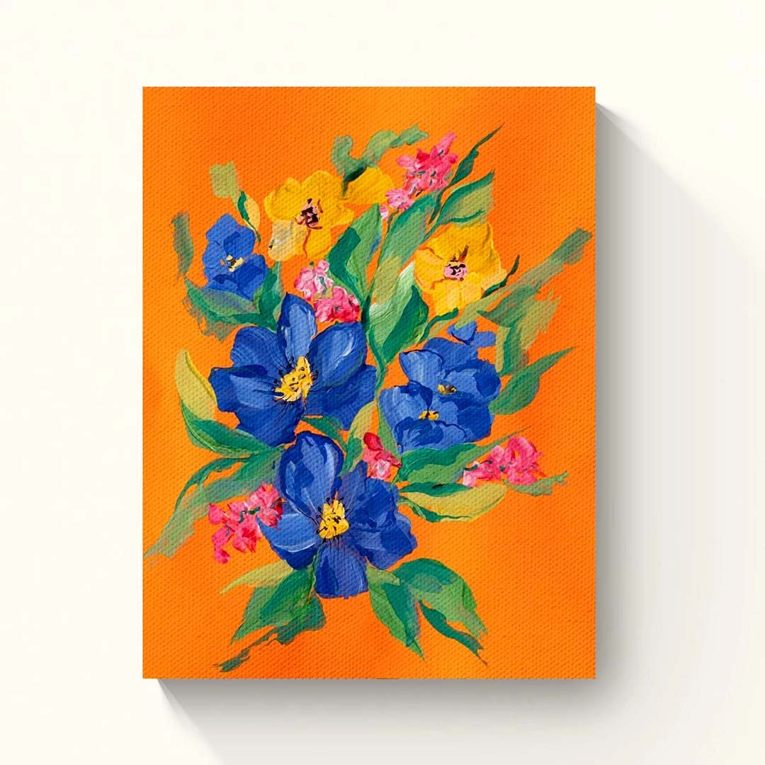 Vibrant Floral Burst is a lively digital illustration featuring a stylized bouquet in bold blue, yellow, and pink tones against a striking orange background. Clean shapes and a high-contrast palette give it a fresh, contemporary look. Perfect for modern Indian homes or creative spaces, it adds cheerful energy and a bold statement to any wall.