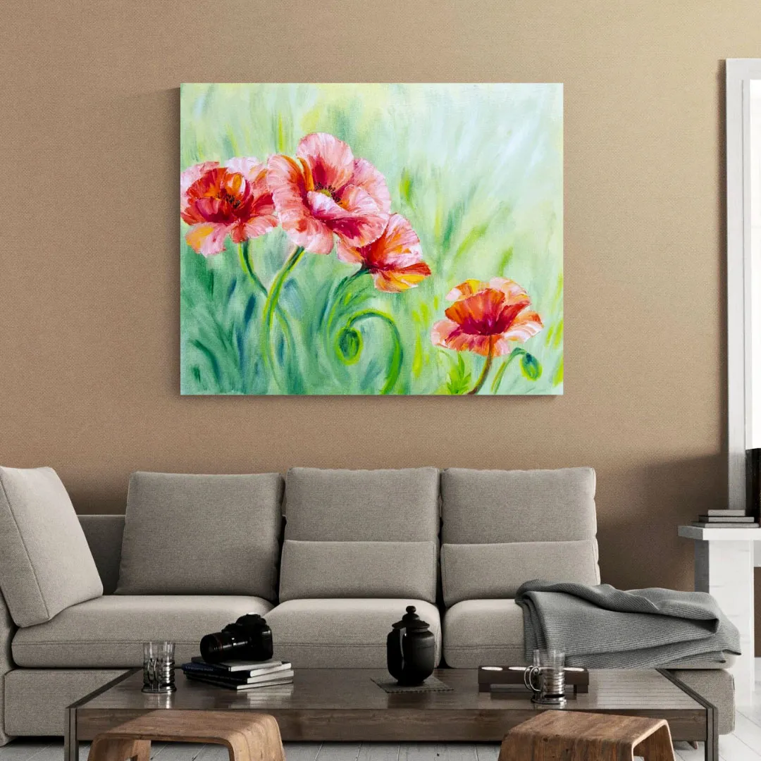 This elegant poppy artwork features three vibrant red-orange blooms set against a soft green background. Smooth, blended brushstrokes create a gentle glow, giving the flowers a dreamy, illuminated quality. Calm yet uplifting, this nature-inspired piece adds warmth, serenity, and quiet beauty to living rooms, bedrooms, or peaceful interior spaces.