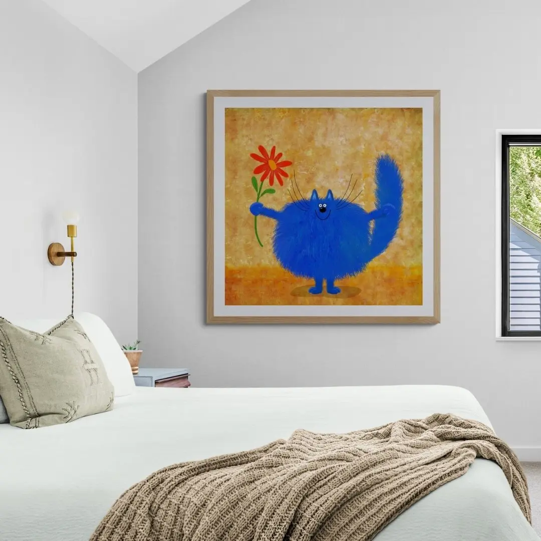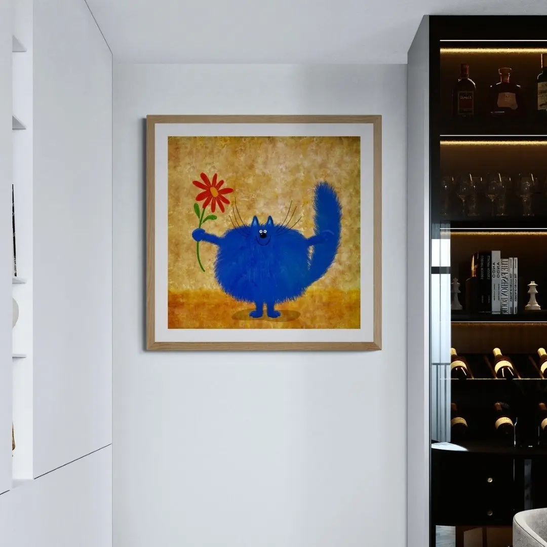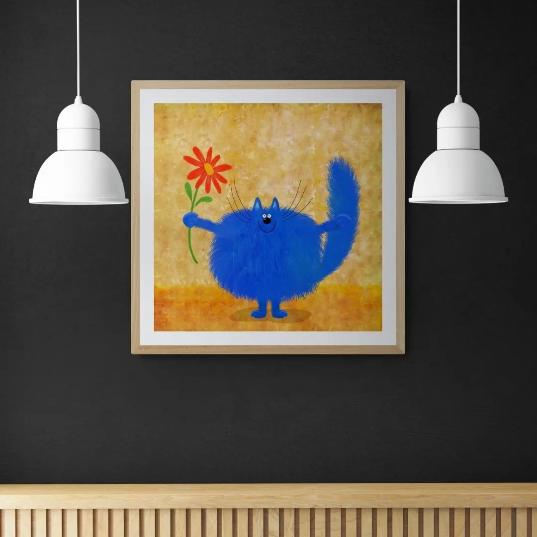 Whimsical Blue Cat with Flower – Playful Wall Art: Modern Painting Standard Frame Wall Décor