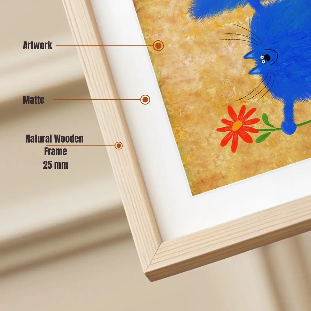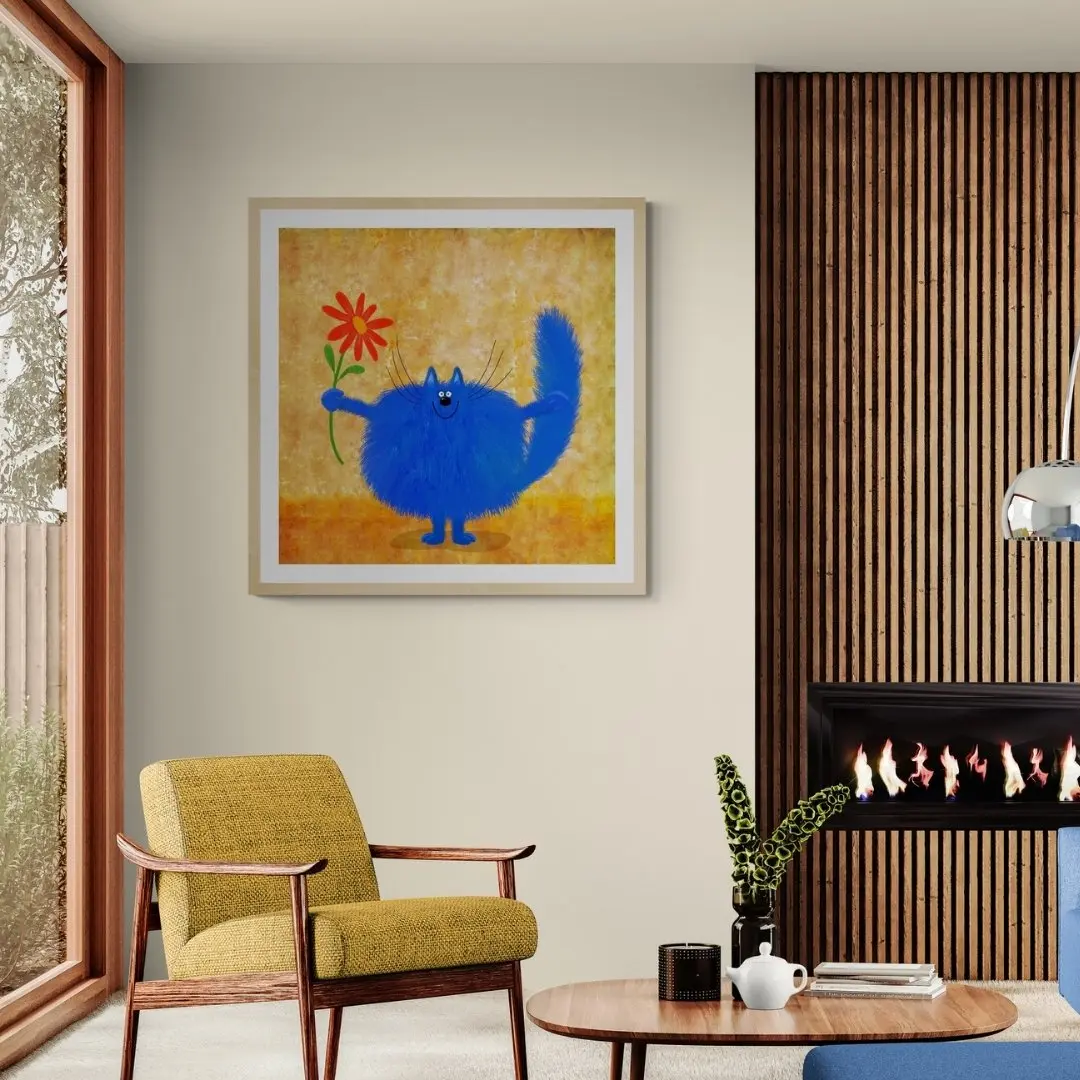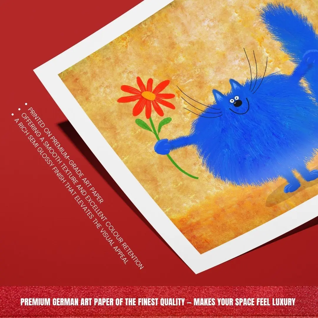 Whimsical Blue Cat with Flower – Playful Wall Art: Modern Painting Standard Frame Wall Décor